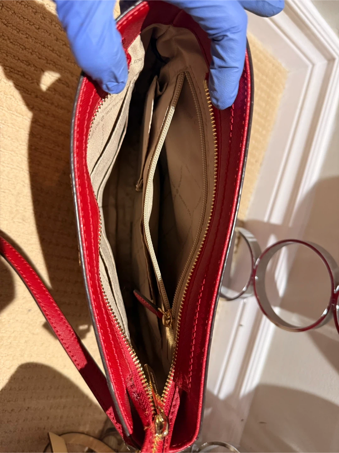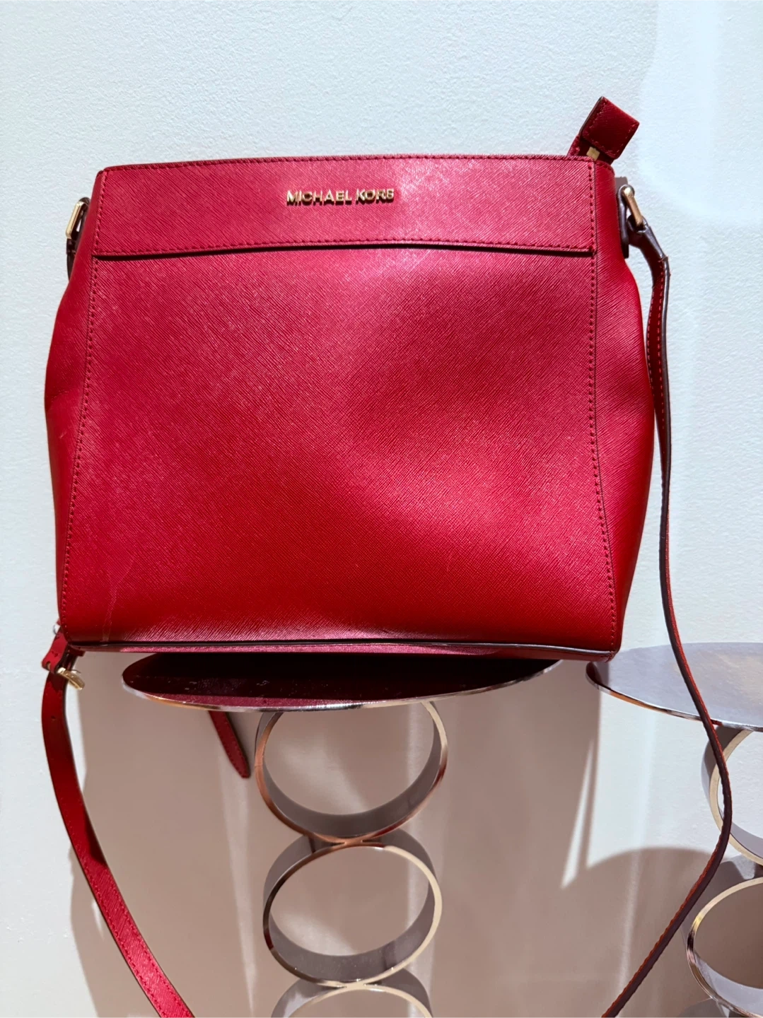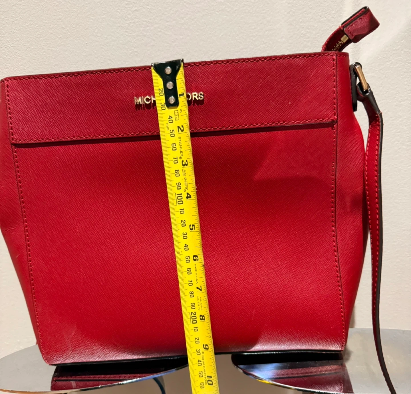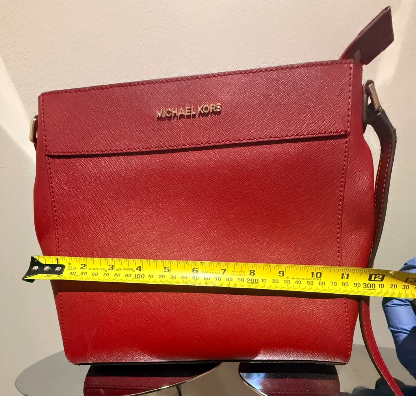 A stylish red crossbody bag from Michael Kors! It's in good condition and ready for a new home. The bag measures approximately 10 inches in length and 9 inches in height, making it a great size for everyday use