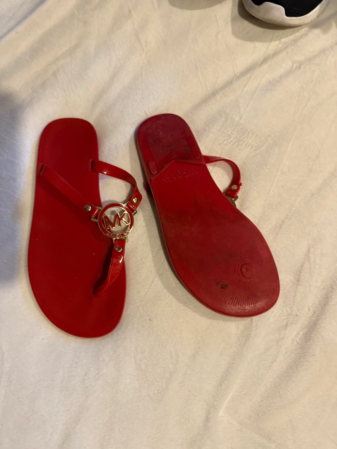 Cute red Michael Kors flip flops! They have the classic MK logo detail. Perfect for summer or wearing around the house. Size not indicated.