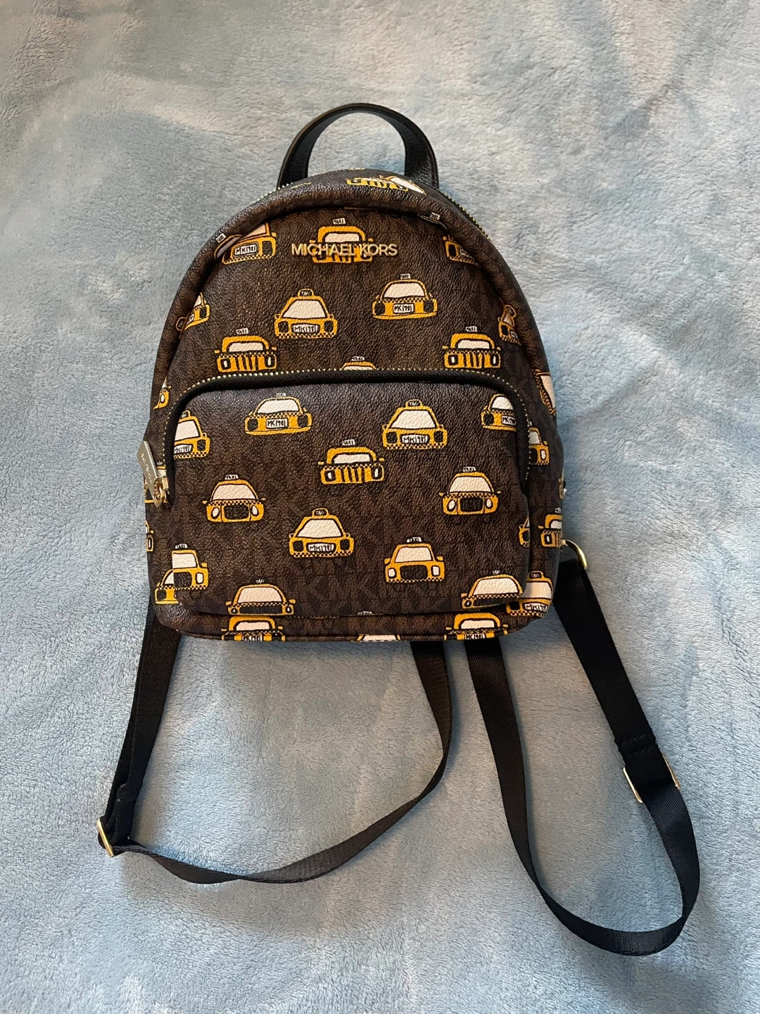 Super cute Michael Kors mini backpack with a fun taxi print! It's in great condition and perfect for carrying your essentials. The adjustable straps make it comfortable to wear, and the compact size is ideal for everyday use or travel