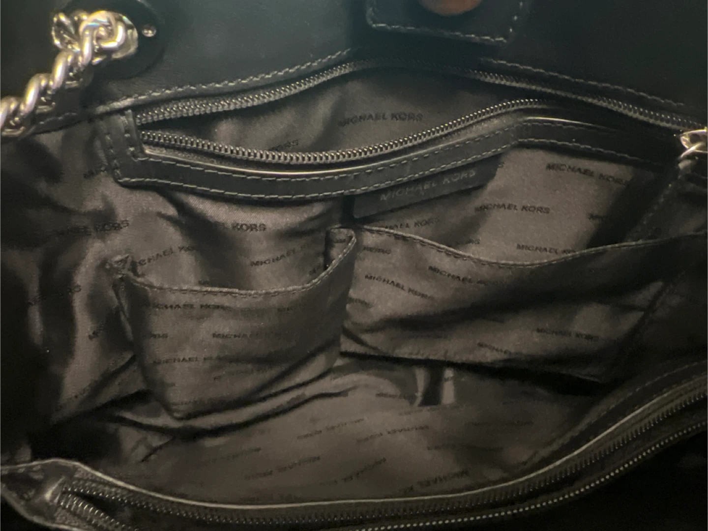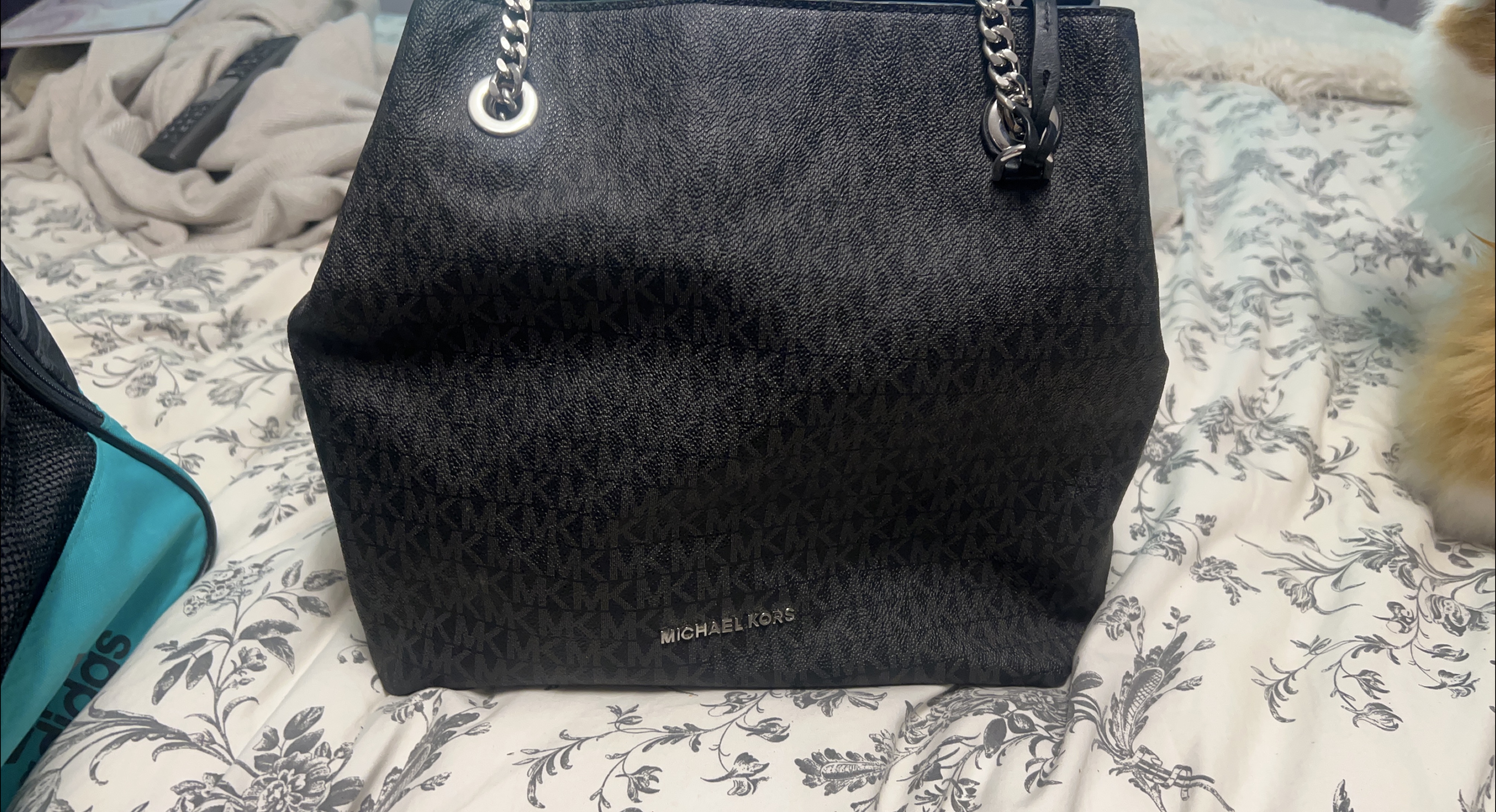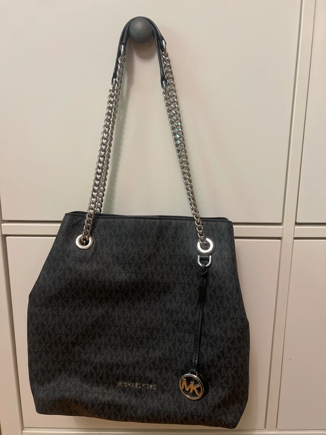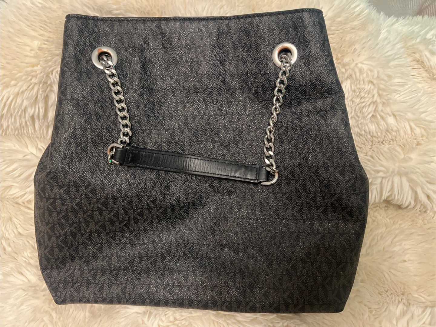 Selling a Michael Kors tote bag in black. It features a chain detail on the straps and the classic MK logo pattern. Perfect for everyday use! Very rarely used, cleaning undamaged lining. Minor scuffs/colour loss on bottom and back lower portion. Able to meet in North Van, West Van and some areas of Van.