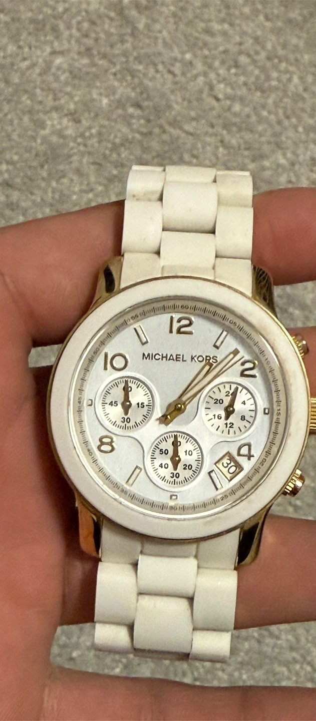 Selling a Michael Kors ladies watch with a white band and gold accents! It's in great condition and ready for a new home