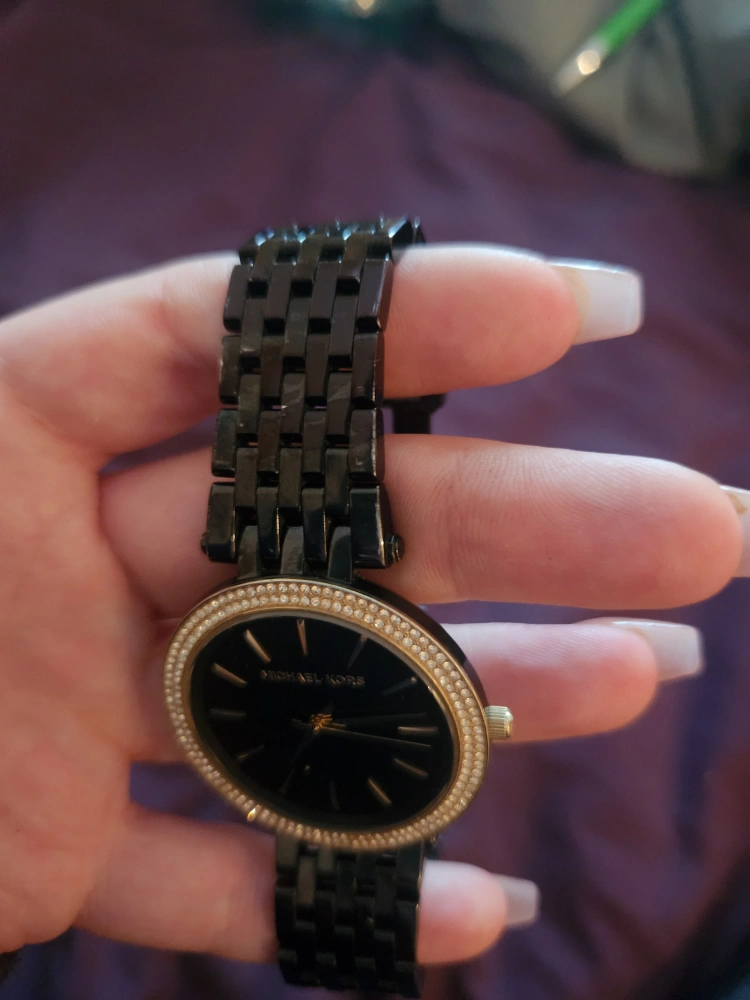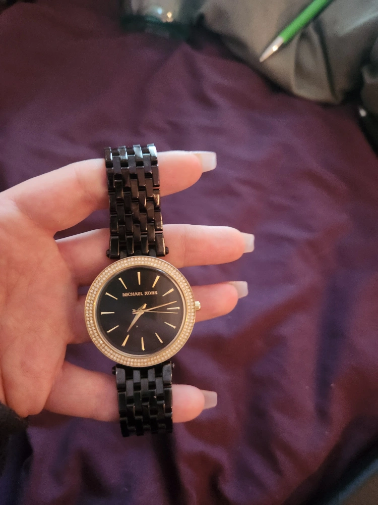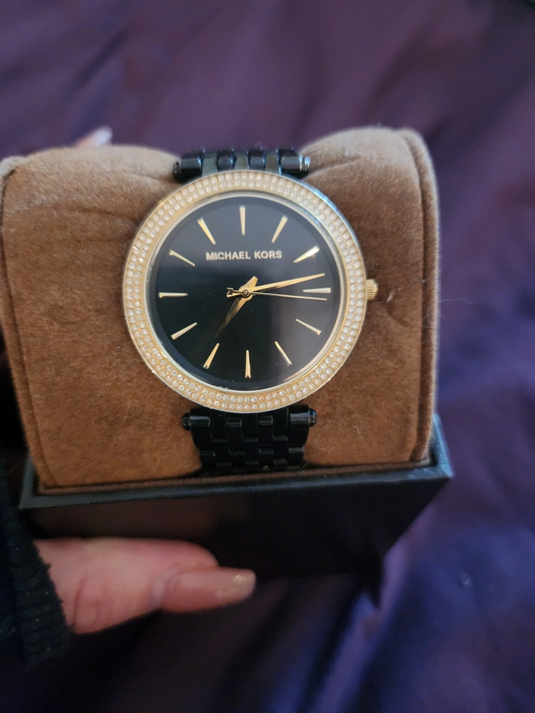 Selling a stylish Michael Kors women's watch. It features a black band and a gold-tone bezel with sparkling accents. Perfect for adding a touch of elegance to any outfit