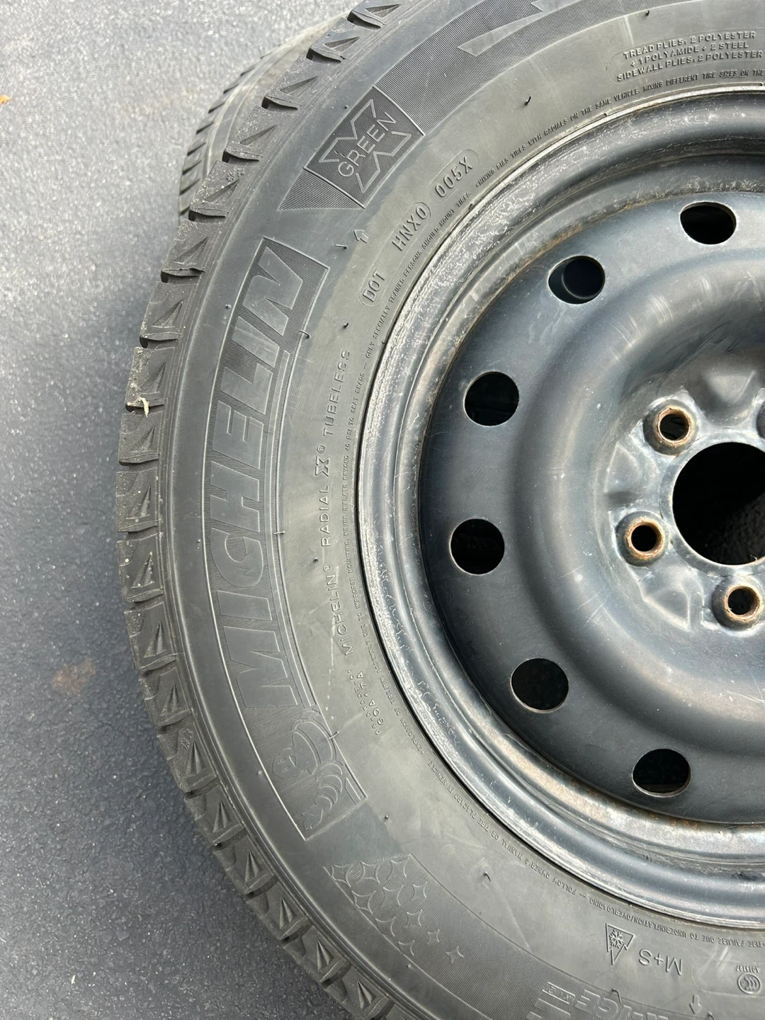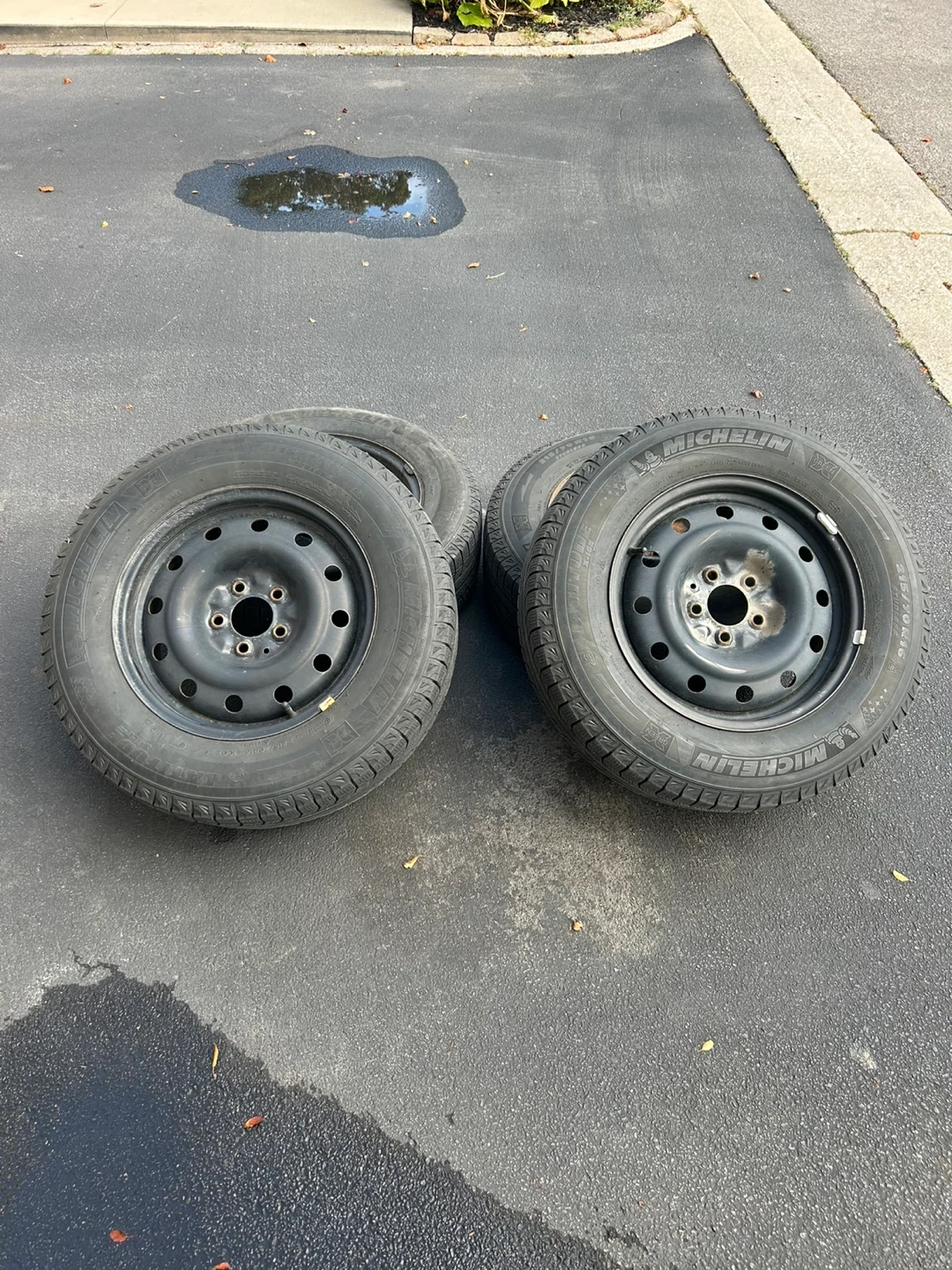 Set of four Michelin X-Ice winter tires mounted on steel rims.