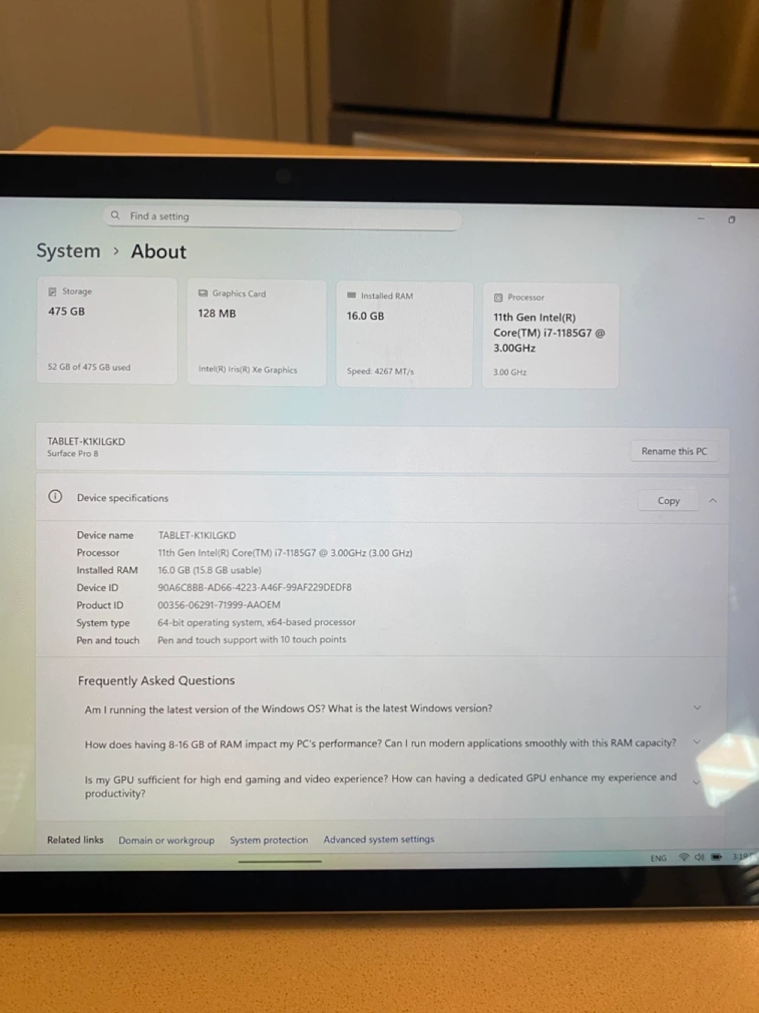 Selling a Microsoft Surface Pro 8 laptop in great condition! It comes with: - 16GB installed RAM - 512 GB storage - 11th Gen Intel(R) Core(TM) i7-1185G7 @ 3.00GHz processor Perfect for work or play!