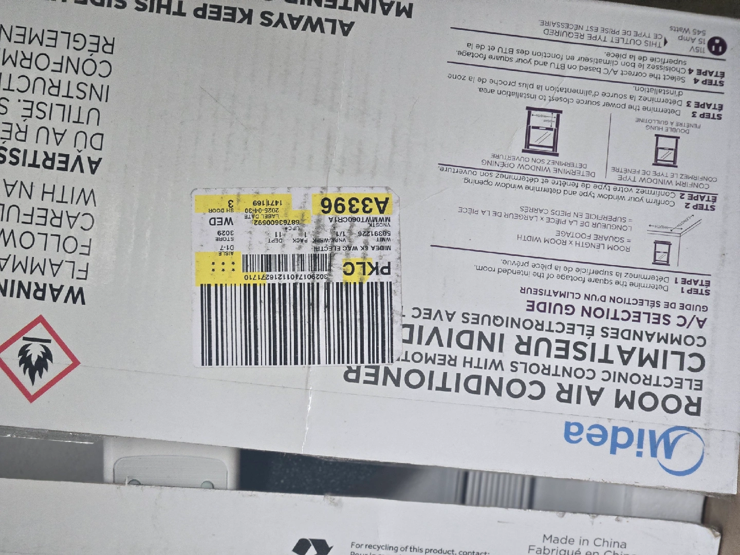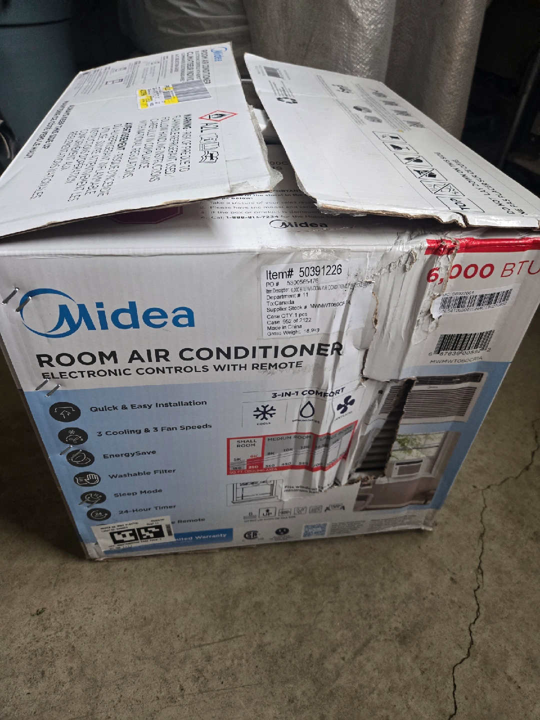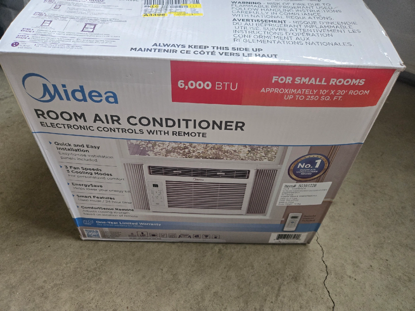 BRAND NEW STILL IN BOX Selling a Midea 6,000 BTU room air conditioner. It's designed for small rooms, approximately 10' x 20' or up to 250 sq ft. It features electronic controls and comes with a remote for easy operation. It has quick and easy installation and includes installation panels. The unit offers 3 fan speeds and 3 cooling modes for personalized comfort, along with an EnergySave feature to help lower your energy bill. It also has smart features like a sleep mode and a 24-hour timer. Also includes a ComfortSense remote which adjusts based on location of remote