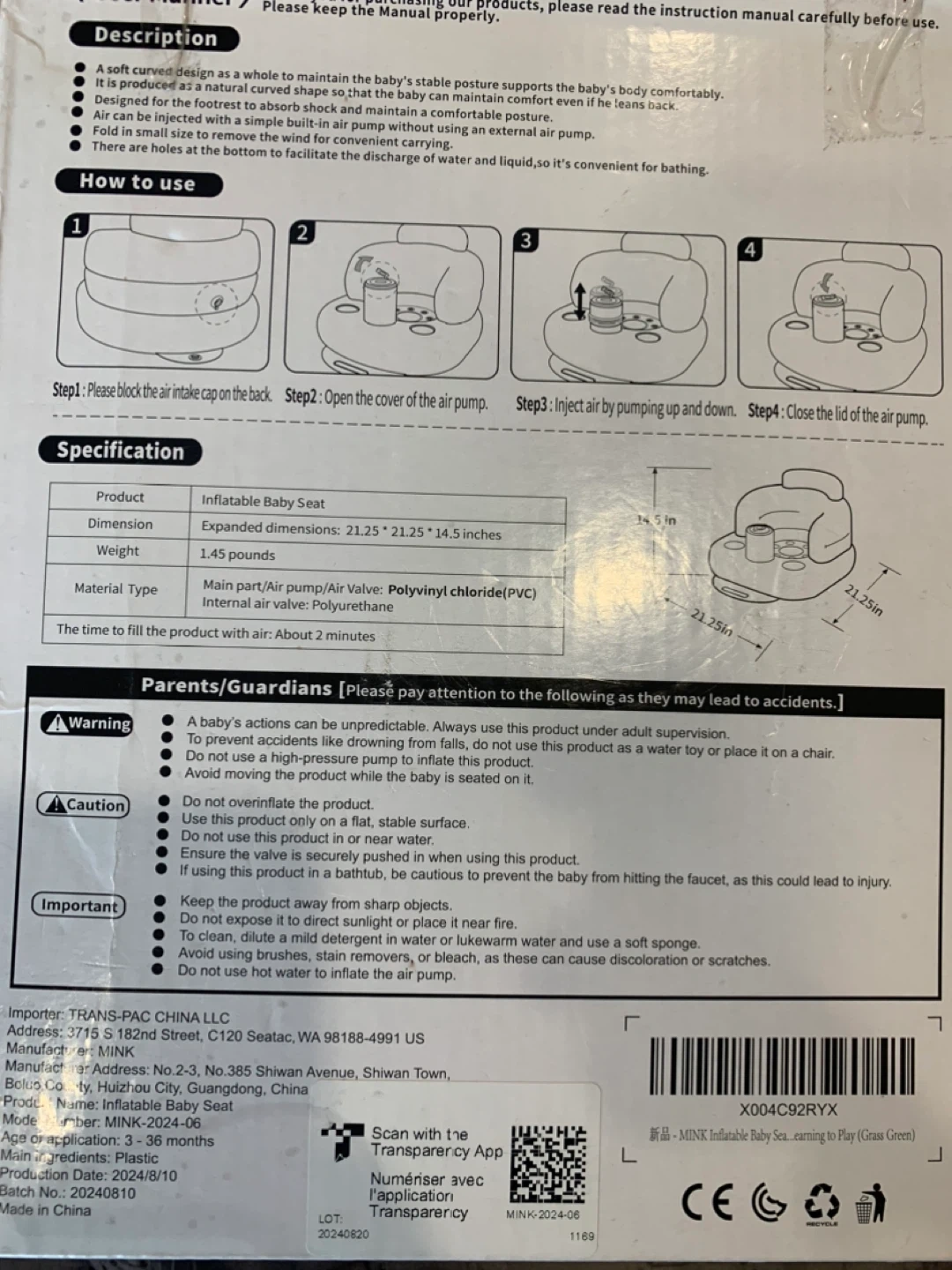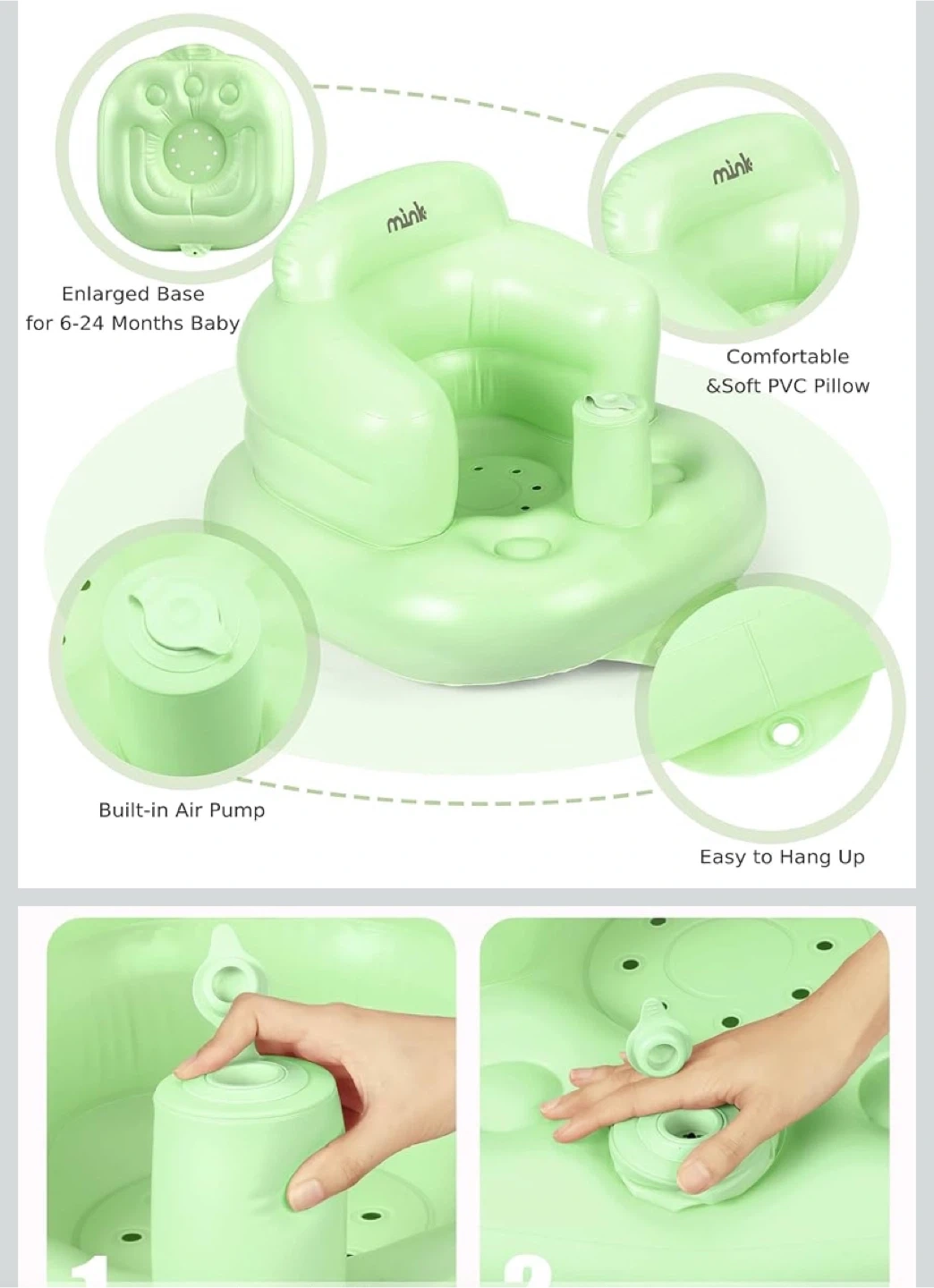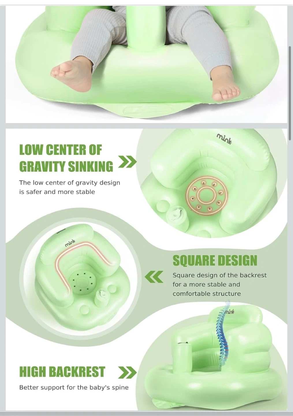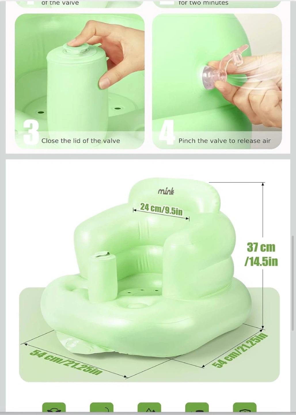 Selling a Mink baby inflatable seat, perfect for little ones aged 3-36 months! It features a low center of gravity design for better stability and a high backrest to support your baby's spine. - Square design for a more stable and comfortable structure - Built-in air pump for easy inflation - Comfortable & soft PVC pillow - Enlarged Base for 6-24 Months Baby Expanded dimensions: 21.25" * 21.25" * 14.5 inches