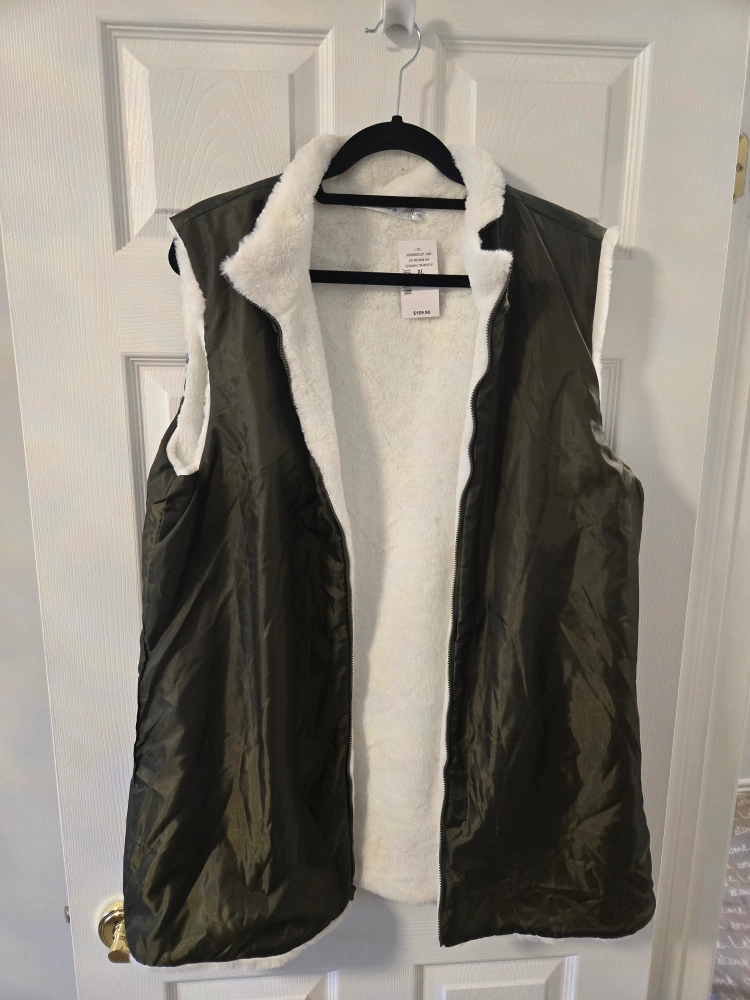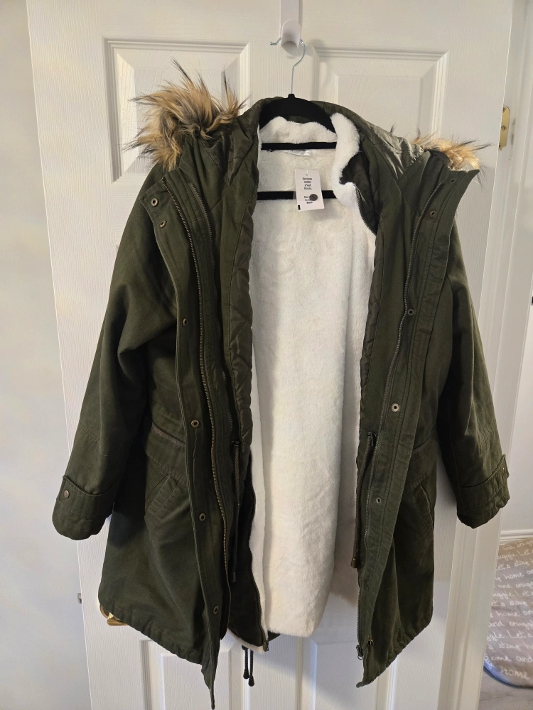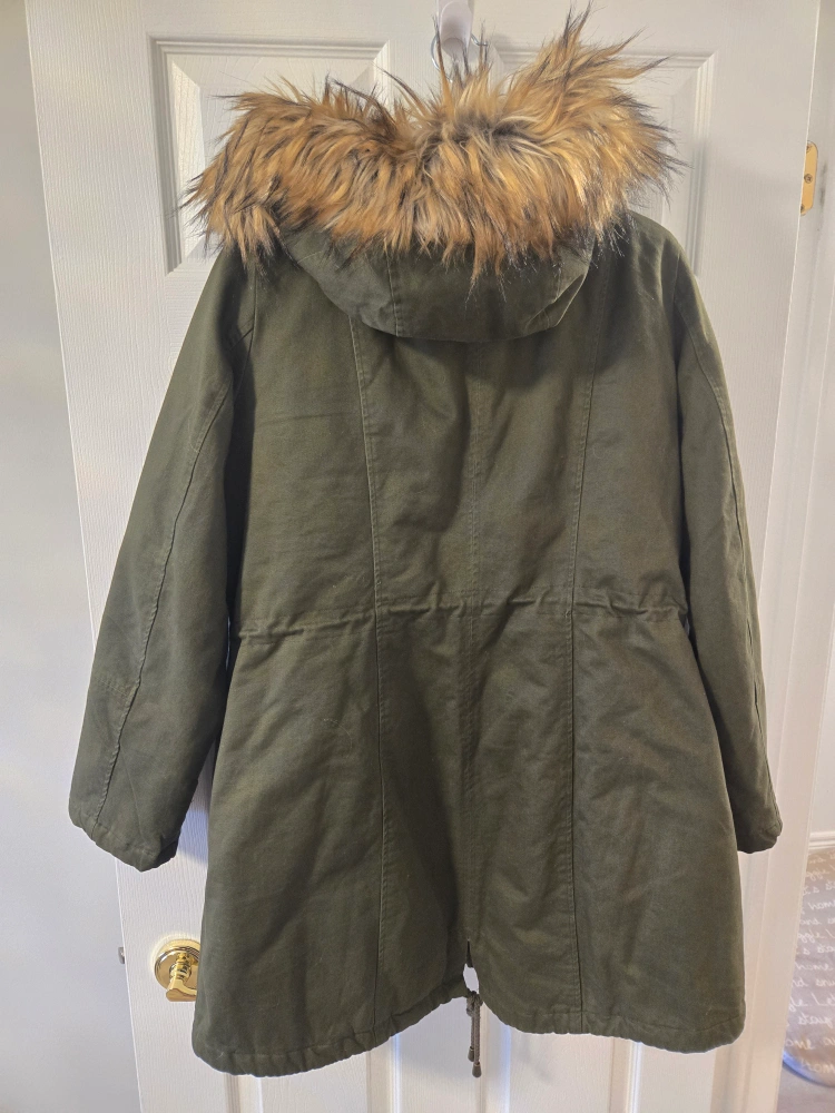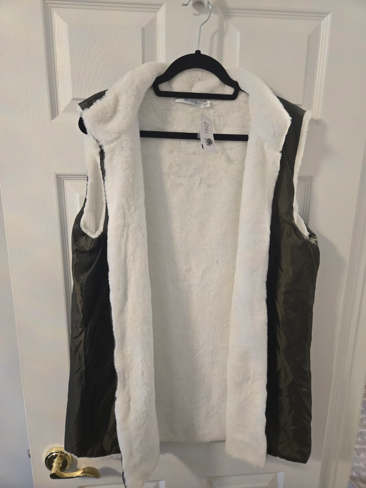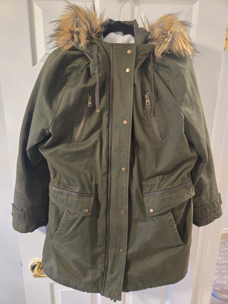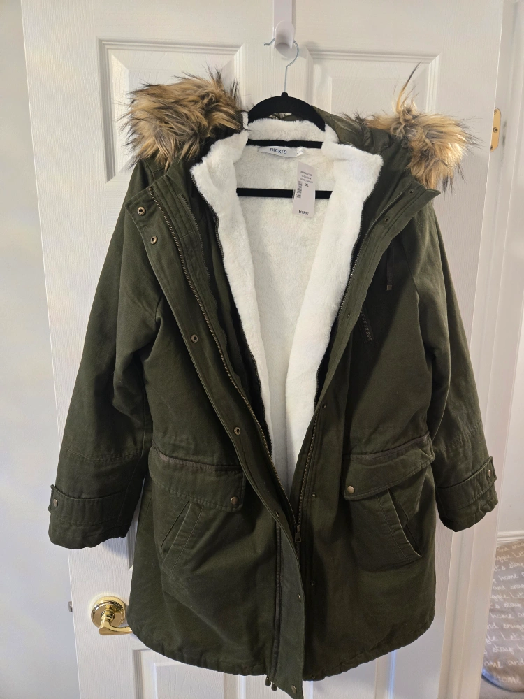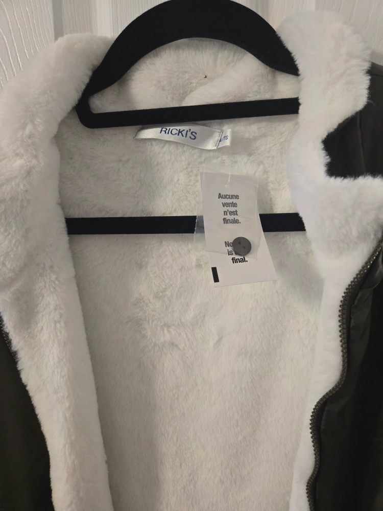 Selling a Miro's parka in olive green! It has a faux fur trimmed hood and a cozy faux fur lining. Size is XL. The original tag shows it was $119.99 Purchased at Ricki's in Vaughan Mills Mall. Brand new with tags, never worn before. All Zippers and pockets are functioning properly. No holes. Detachable vest. Pick up in Vaughan.