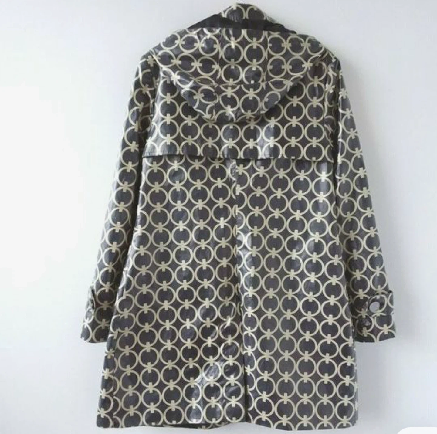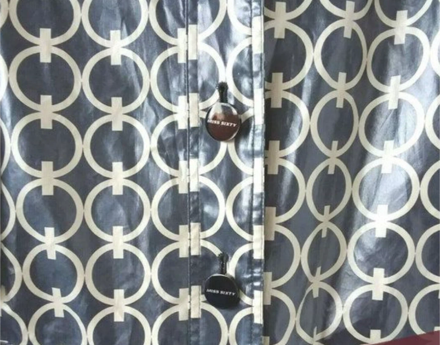 Miss Sixty M60 Mid-Length Hooded Raincoat EUC Miss Sixty M60 Women's -Mid-Length Hooded Raincoat - detachable lined hood with cinching cord -5-button closure - fully lined - two flap pockets - strap detail at the cuffs - split tail - - gray with tan graphics In excellent condition Meet up & cash only pls Meet up is in Nobleton