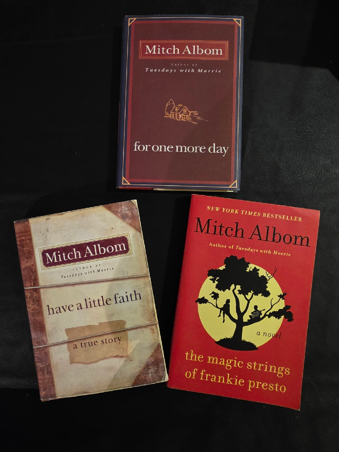 Selling a bundle of three Mitch Albom books! Includes: - Have a Little Faith: A True Story - For One More Day - The Magic Strings of Frankie Presto: A Novel