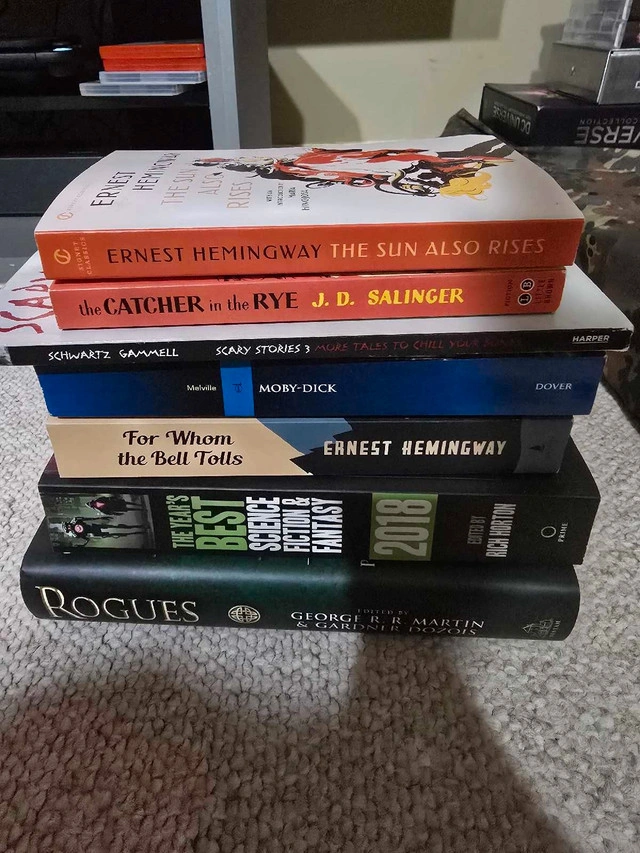 Dive into a world of classic literature with this curated book collection! This used lot features timeless titles such as Ernest Hemingway's 'The Sun Also Rises' and 'For Whom the Bell Tolls', J.D. Salinger's 'The Catcher in the Rye', 'Moby Dick', 'Scary Stories 3' , 'The Year's Best Science Fiction & Fantasy 2018', and 'Rogues' by George R.R. Martin & Gardner Dozois. Each book has been enjoyed and shows some signs of wear, adding character to these literary treasures. While these books have journeyed through time and pages, they're ready for a new chapter with you. If this ad is up, the books are still available, so grab them before they embark on another adventure! Used Price Estimate: $4-$8 per book