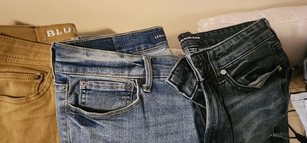 Selling a mixed lot of jeans from various brands including Aeropostale, Calvin Klein, and Zara Man. All in very good condition.