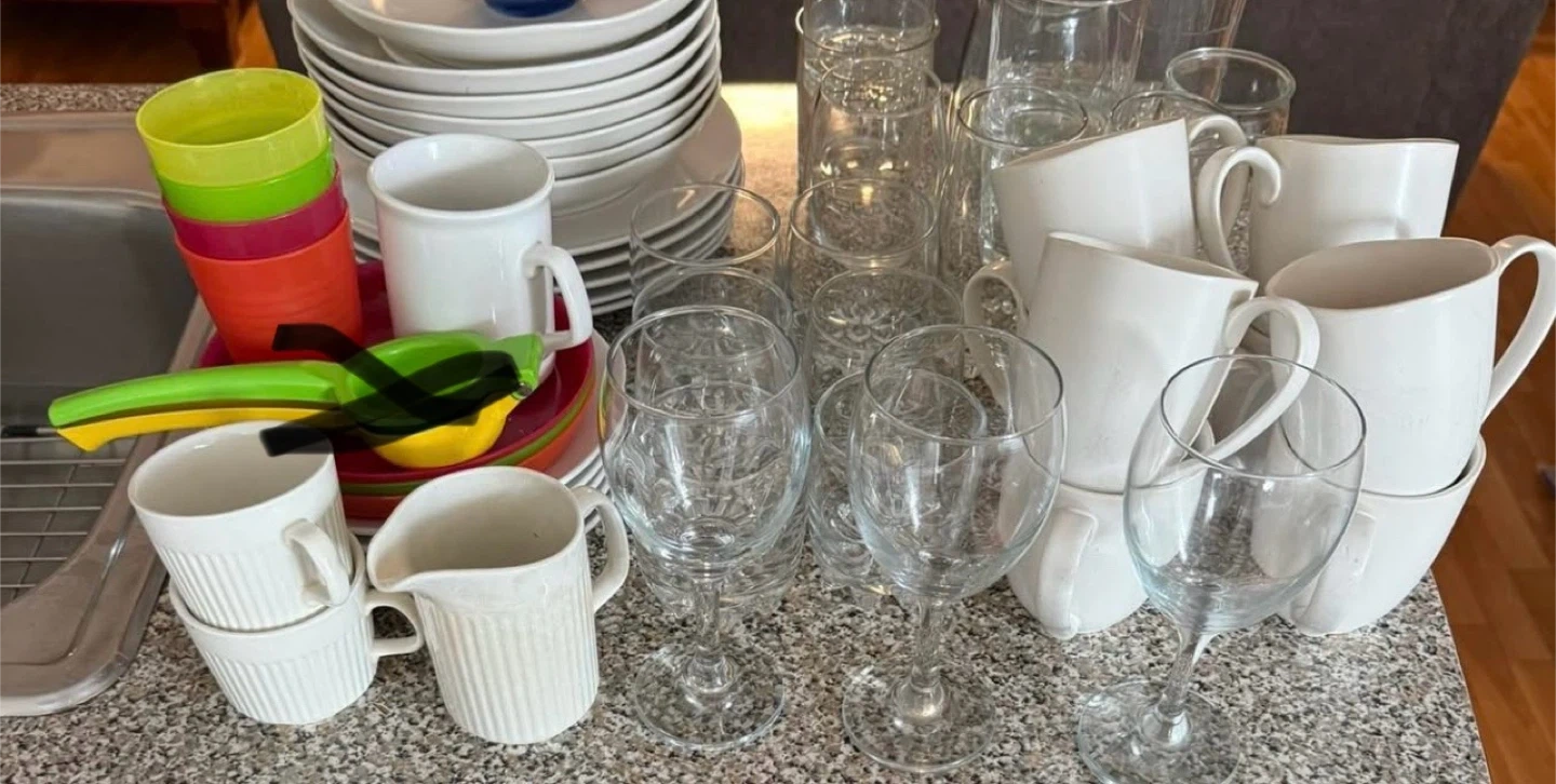 A collection of mixed kitchenware including plates, glasses, mugs, and a large black pot. Perfect for stocking a new kitchen or adding to your existing collection. Items show some signs of use but are generally in good condition and ready for a new home,$1 to $20