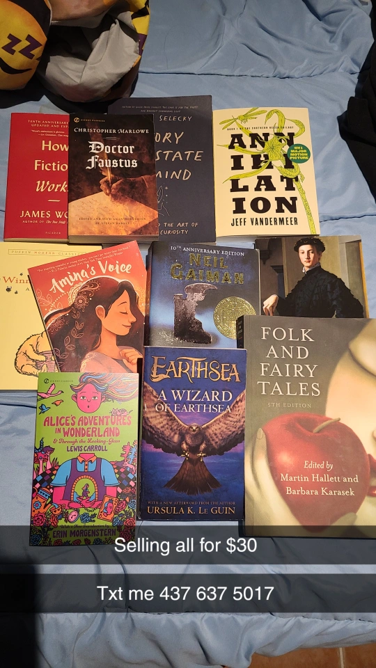 Selling a mixed lot of books for $30! Includes titles like: - How Fiction Works by James Wood - Doctor Faustus by Christopher Marlowe - Annihilation by Jeff VanderMeer - Amina's Voice - Alice's Adventures in Wonderland by Lewis Carroll - A Wizard of Earthsea by Ursula K. Le Guin - Folk and Fairy Tales