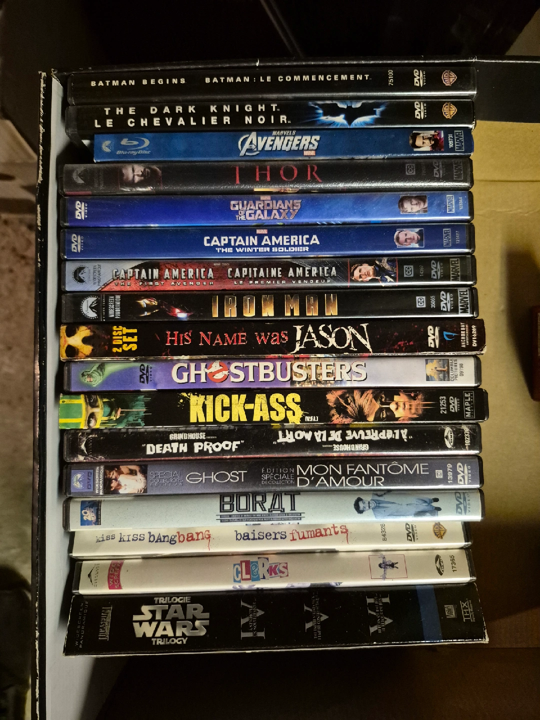 Selling a collection of DVDs including titles like Batman Begins, The Dark Knight, Avengers, Thor, Guardians of the Galaxy, Captain America, Iron Man, Ghostbusters, Kick-Ass, Star Wars Trilogy and more. ~$5 per movie but am open to offers.