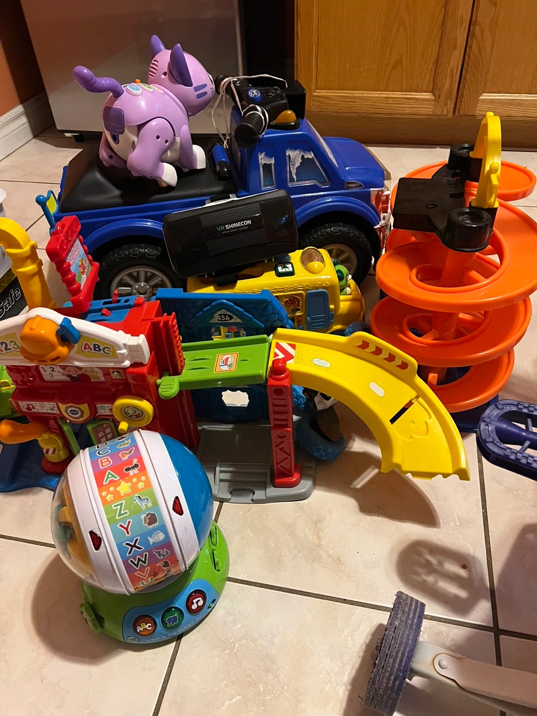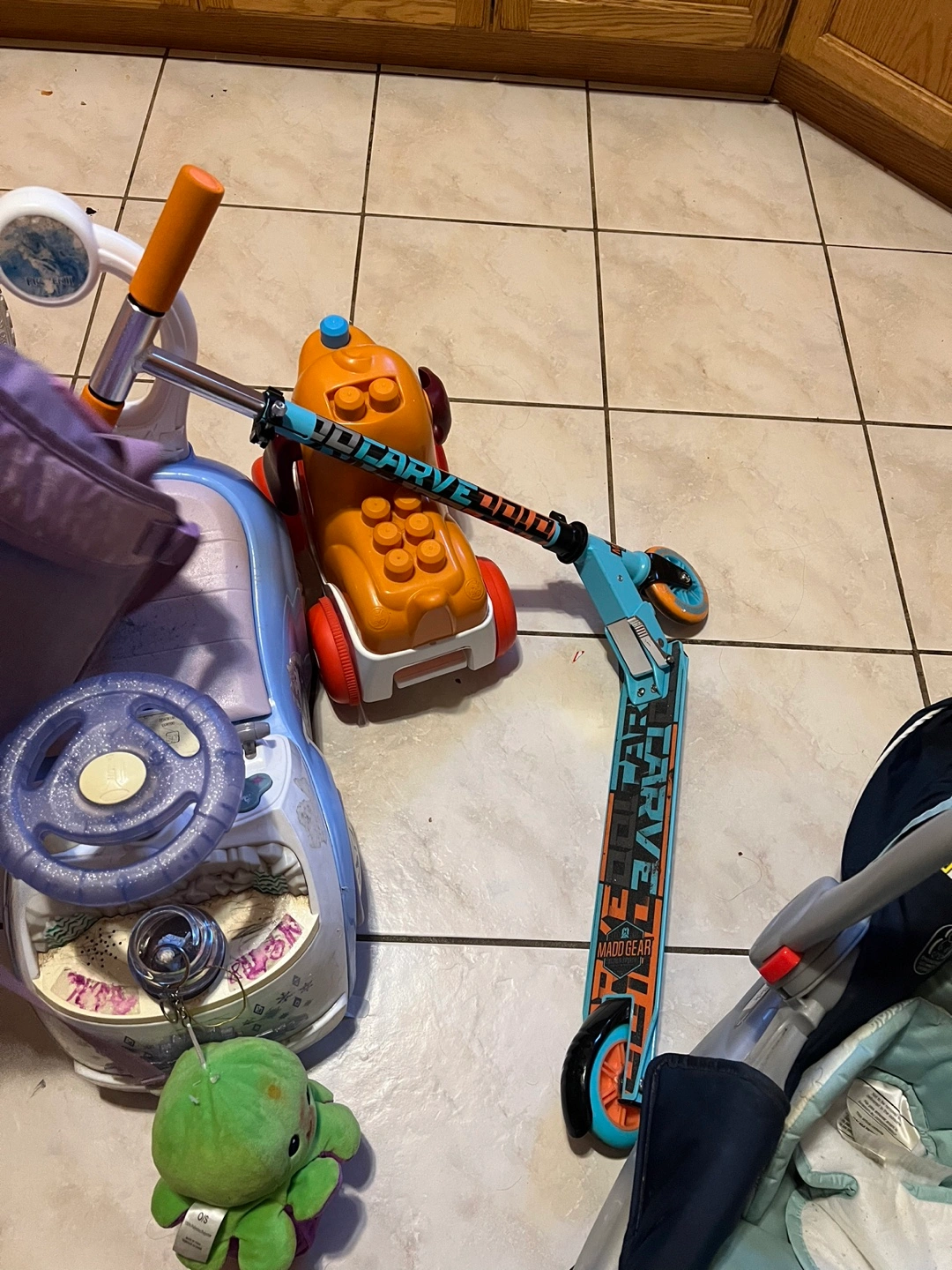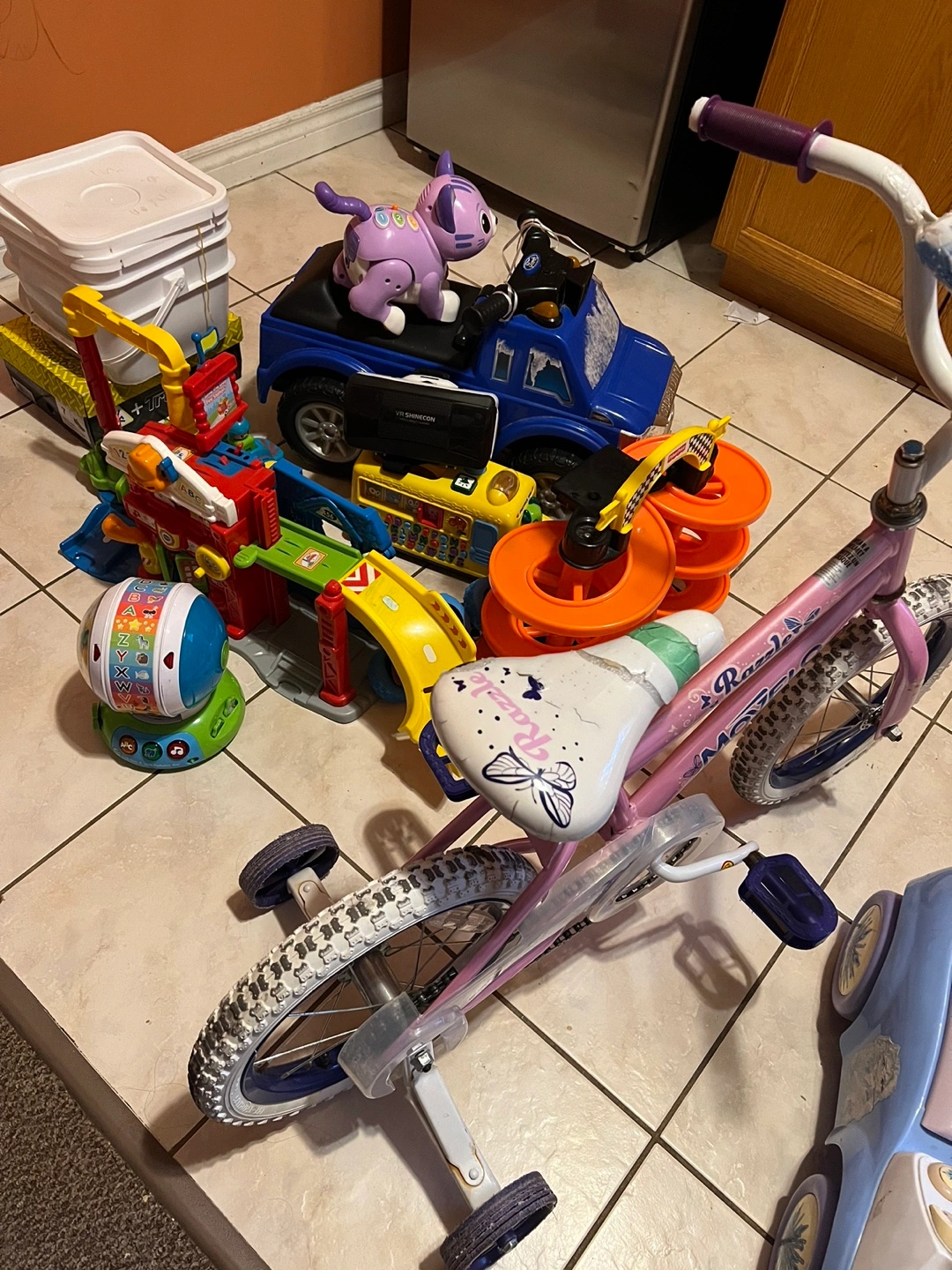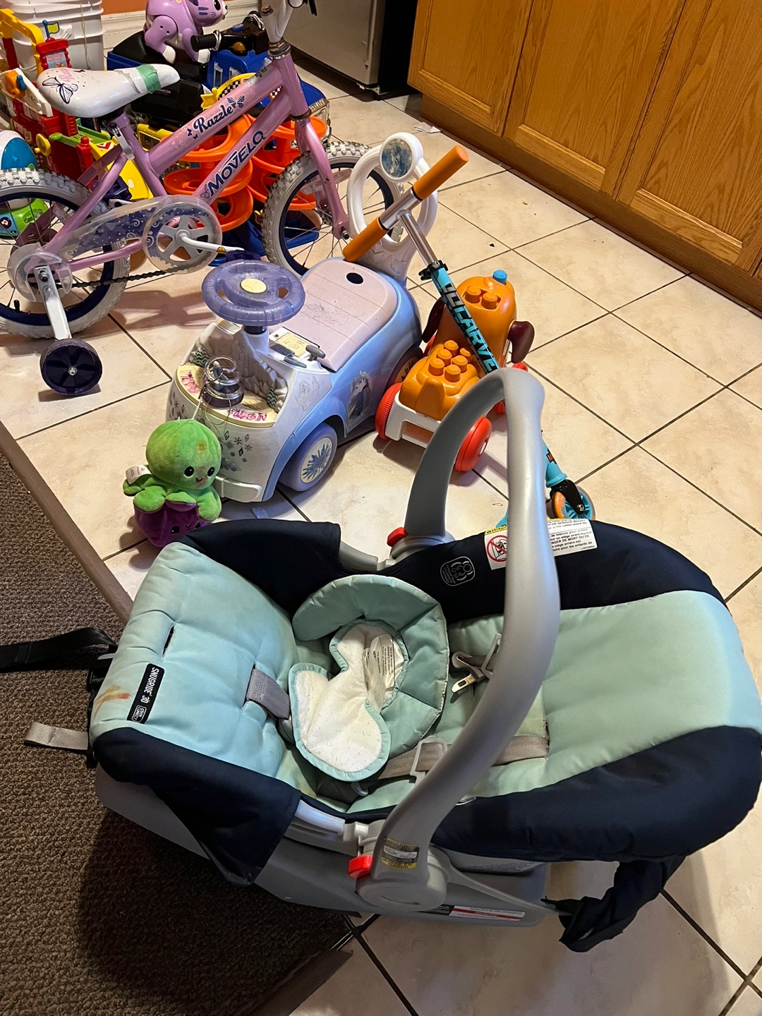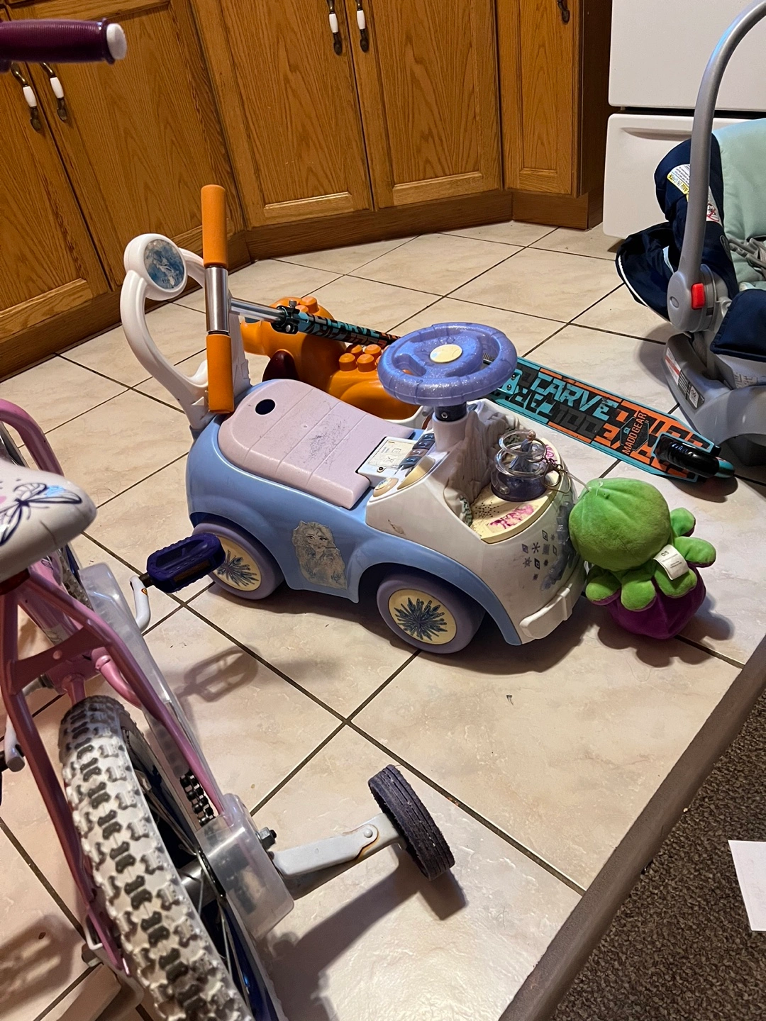 Selling a mixed lot of gently used kids' toys, including a pink Razor bicycle, a blue Disney Frozen ride-on car, and various other toys. Also included is a car seat. Perfect for stocking up on fun items for little ones!
