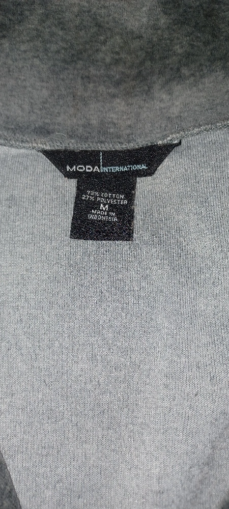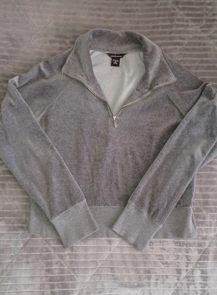 Selling a Moda International velour set in size medium. The set is a lovely grey colour and includes a 3/4 zip top and matching pants. The top is made of 73% cotton and 27% polyester. Perfect for lounging or casual wear!