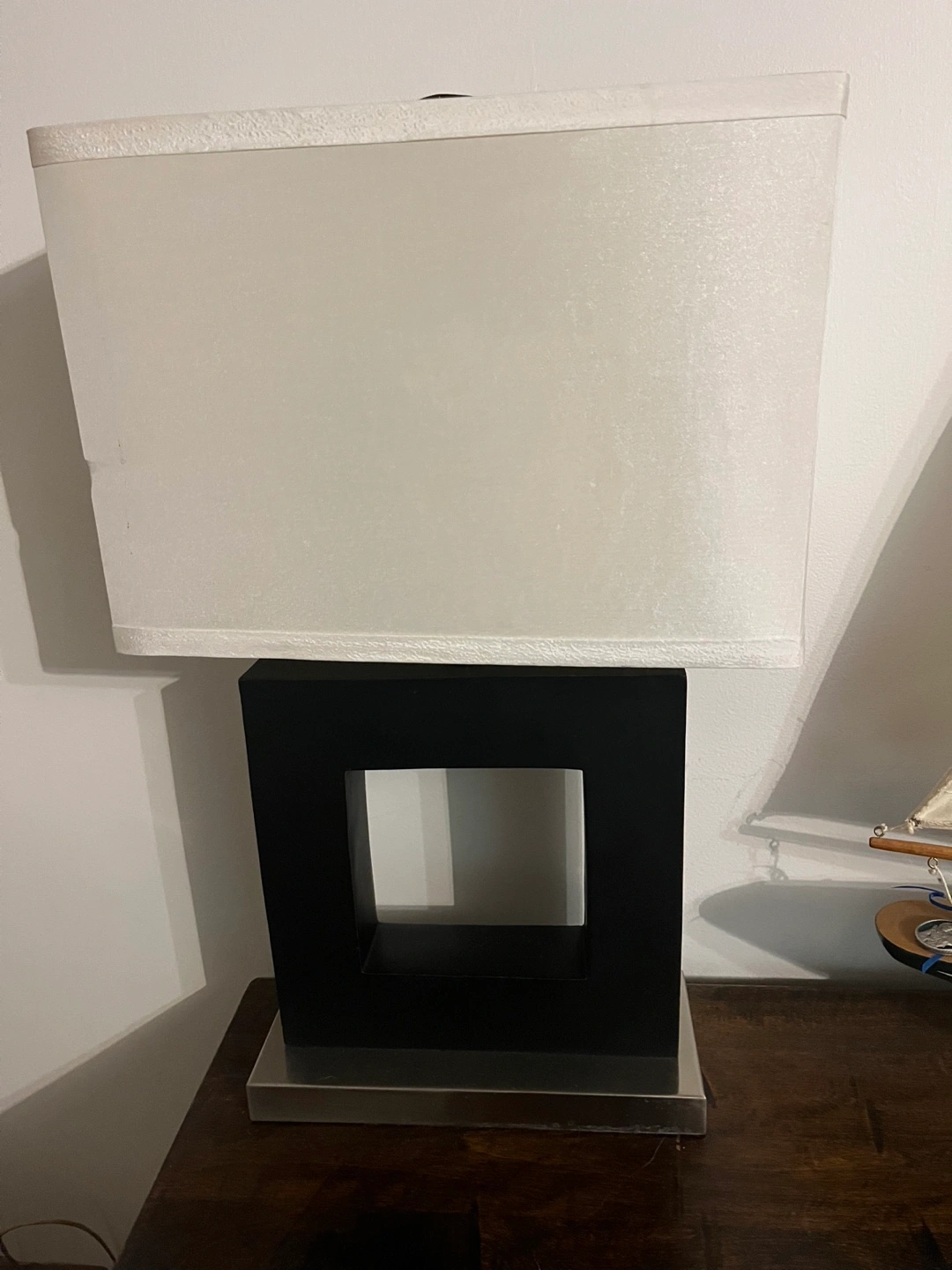 Selling a stylish table lamp with a modern design. It features a black square base and a white rectangular shade. It's in great condition and would look great in any living room or bedroom!