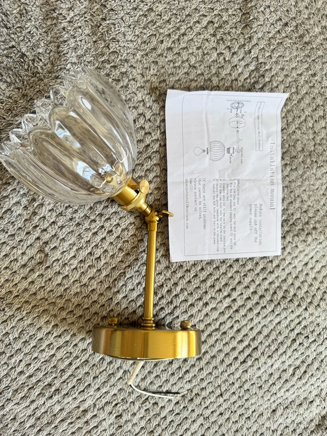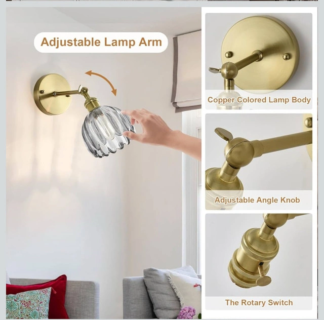 Illuminate your living space with this charming wall sconce, featuring a copper-coloured body and an adjustable lamp arm for directional lighting. The tulip flower shade adds a touch of elegance, and the rotary switch allows for easy on/off operation. Note that the bulb is not included. Specifications: * Light Source: LED (bulb not included) * Power: 120V * Lamp Shade: Tulip flower shade * Features: Adjustable lamp arm, rotary switch Modern Wall Sconces with Clear Tulip Glass Shade, 180 Degree Adjustable Brass Colored Vintage Wall Lights with Switch for Bathroom Bedroom Dinning Room Colour Clear Material Glass, Metal Style Modern Light fixture form Sconce Room type Bathroom, Bedroom, Entryway ADJUSTABLE DESIGN: This vintage glass wall sconce features 180-degree adjustable arm and swivel joint, allowing precise direction of light where needed for optimal illumination VINTAGE STYLE: This gold wall light features a beautiful clear tulip glass lampshade paired with elegant groove patterns, creating elegant, timeless aesthetic suitable for any decor WIDELY APPLICABLE: This clear glass wall lamp will become an artistic decoration for your home space. It creates a warm and cozy atmosphere, making it an excellent choice for areas such as bedrooms, bathrooms, living rooms, entrances, corridors, lobbies, and porches BULB REQUIREMENTS: This modern wall lamp is equipped with an E26 bulb base. Compatible with LED, CFL, Edison, incandescent lamps, etc. MAX 60W, and it is recommended to use T45/A19 bulbs. Light bulbs are not included. The dimming function can only be achieved when you select the dimming bulb and dimmer switch CONVENIENT CONTROL: This industrial wall sconce has a built-in rotary switch for easy on/off control, without the need for additional wiring or wall switches CLASSIC DIMENSIONS: Wall Sconce width: 8.8"; Height: 9.2"; Glass shade diameter: 5.0"; Installation plate diameter: 4.7 inches, providing ideal proportions for most indoor spaces