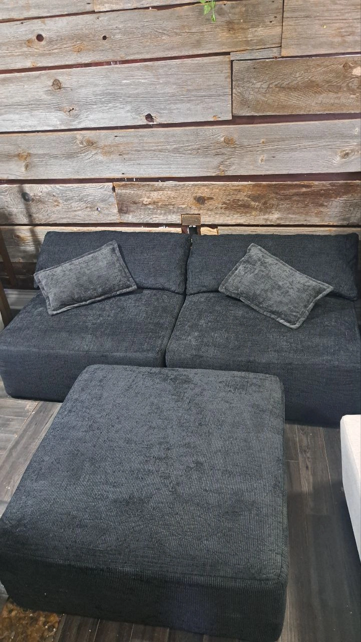 Selling a modular sectional sofa in a dark grey colour. It's in great shape and ready for a new home! Perfect for creating your own custom seating arrangement. The material is soft and comfortable, making it a cozy spot to relax