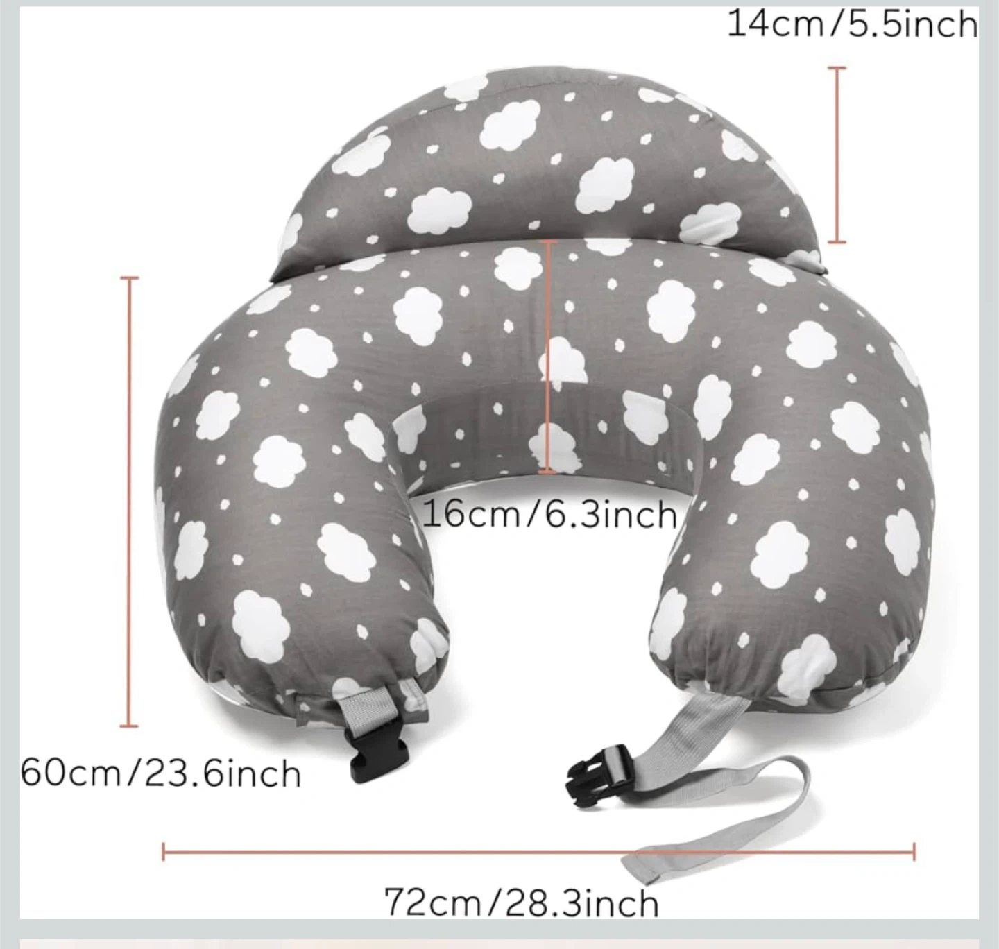 Great condition- barely used. Cozy nursing pillow featuring a cute grey cloud print! It measures approximately 23.6 inches in height and 28.3 inches in width, providing ample support for you and your little one during feeding time