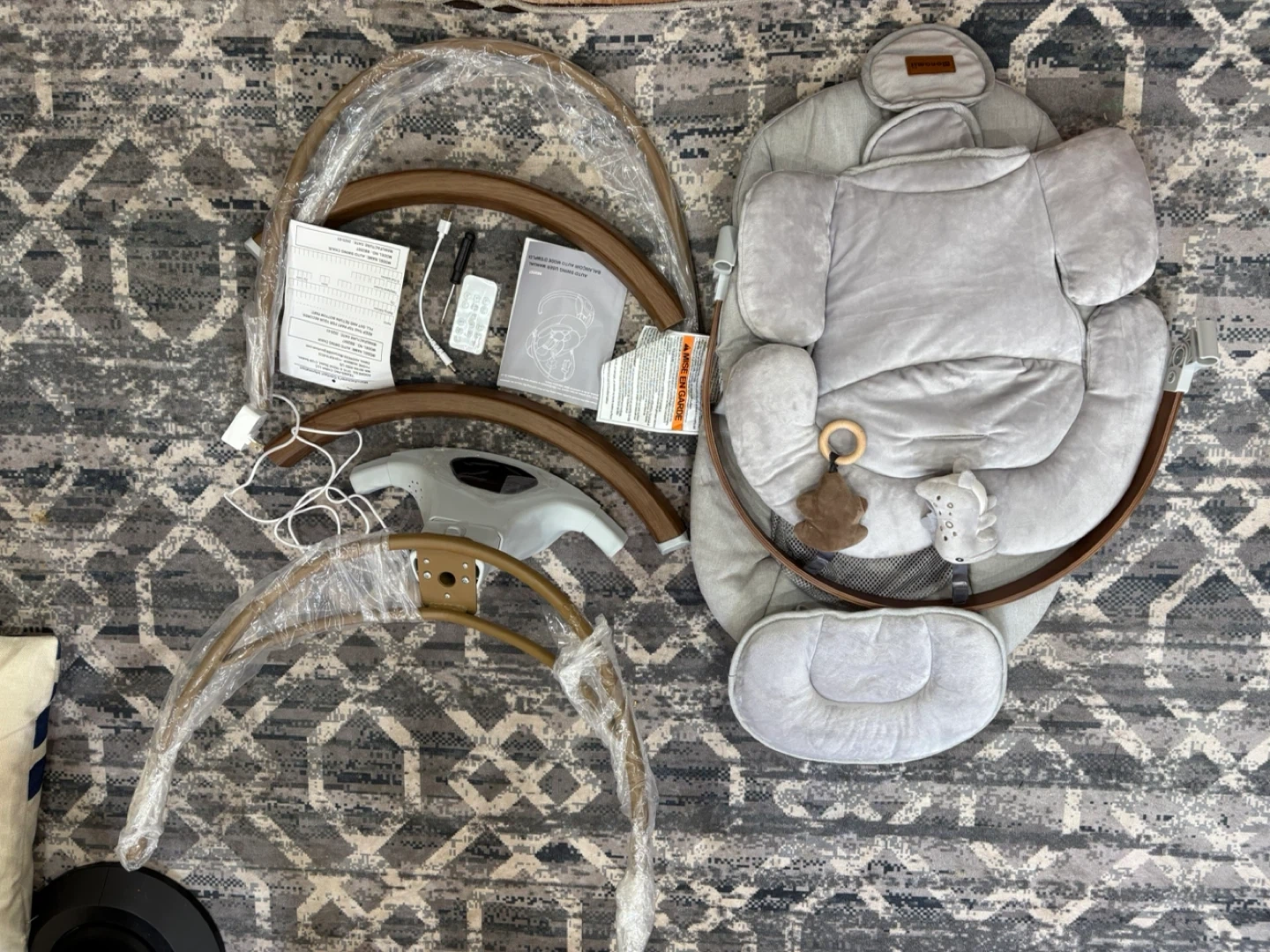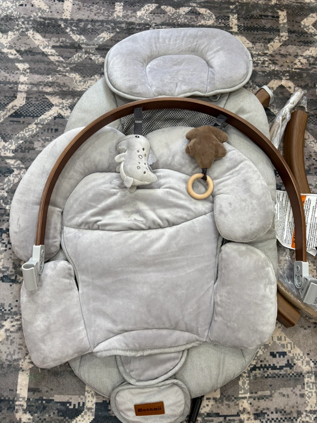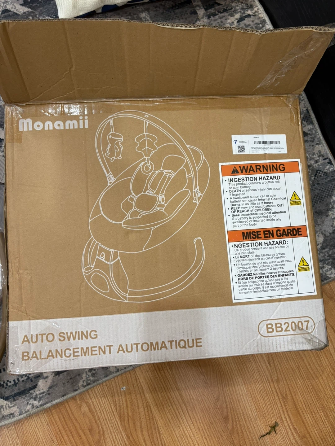Selling a Monamii baby swing in excellent condition! It comes with all the original parts and accessories, including the remote control and instruction manual. The swing features multiple speeds, a music speaker, and a remote control, making it perfect for indoor or outdoor use. It's a light grey colour and has been well taken care of, so it's ready for a new home! The swing is $230 on Amazon. I don’t need it and this has not been used at all just opened the box to take the pictures. Willing to sell it for $140. Price is negotiable.