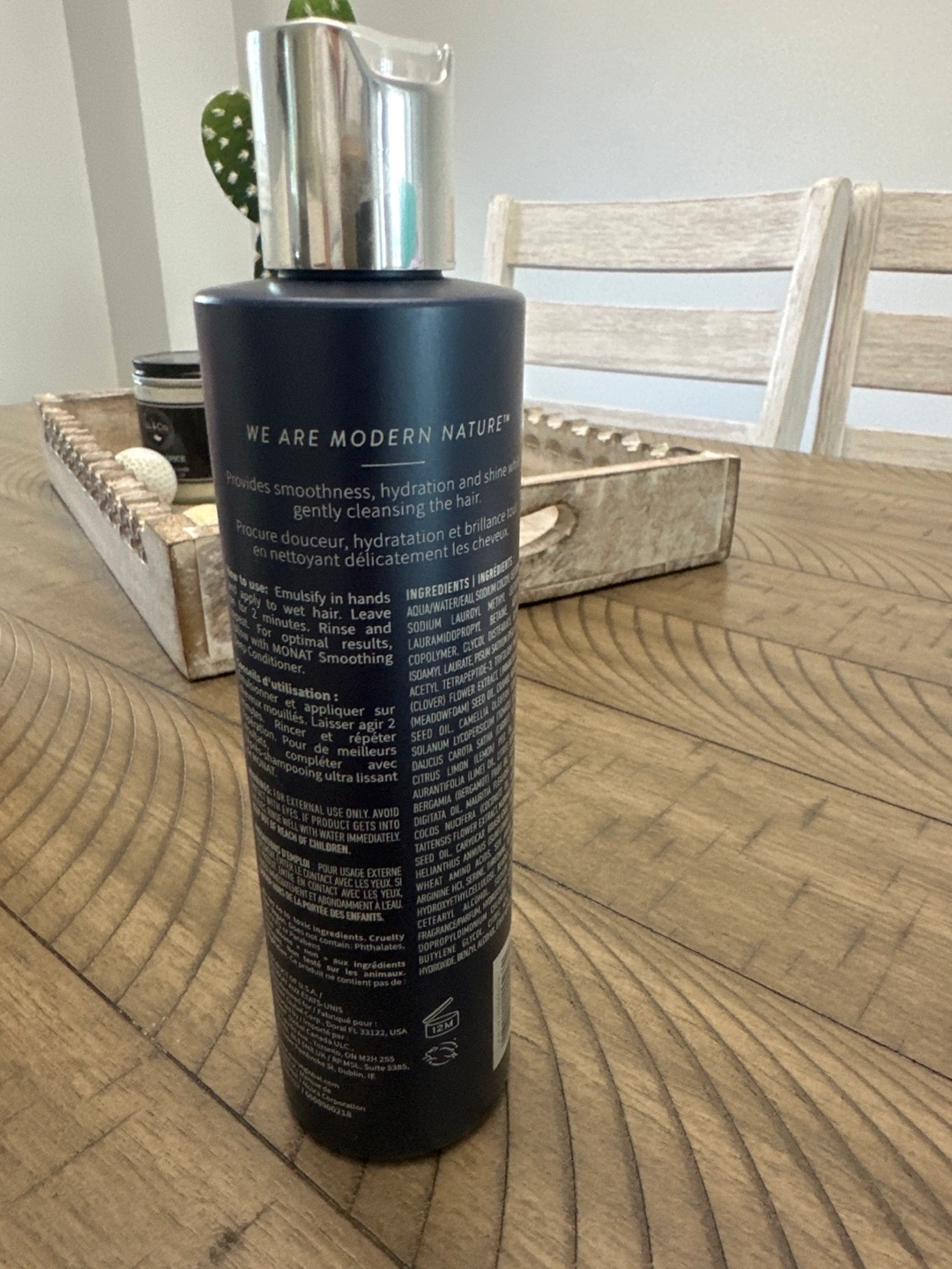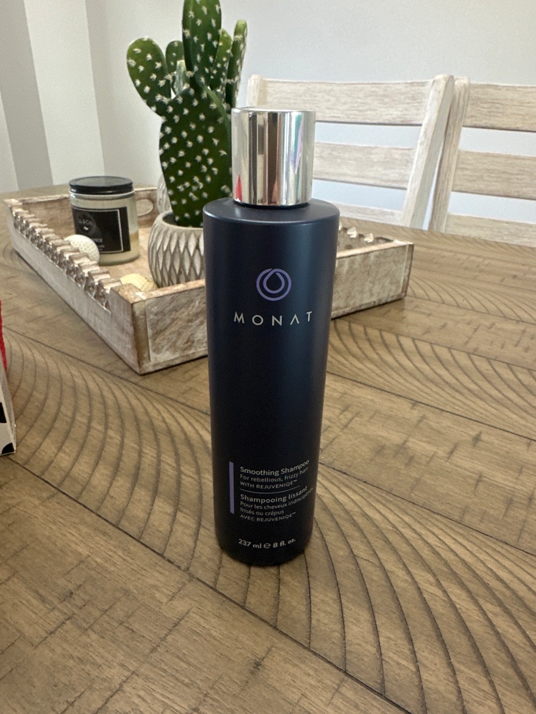I'm selling a bottle of Monat Smoothing Shampoo. It's designed for rebellious, frizzy, or curly hair and helps to smooth and gently cleanse the hair. The bottle contains 237 ml or 8 fl oz
