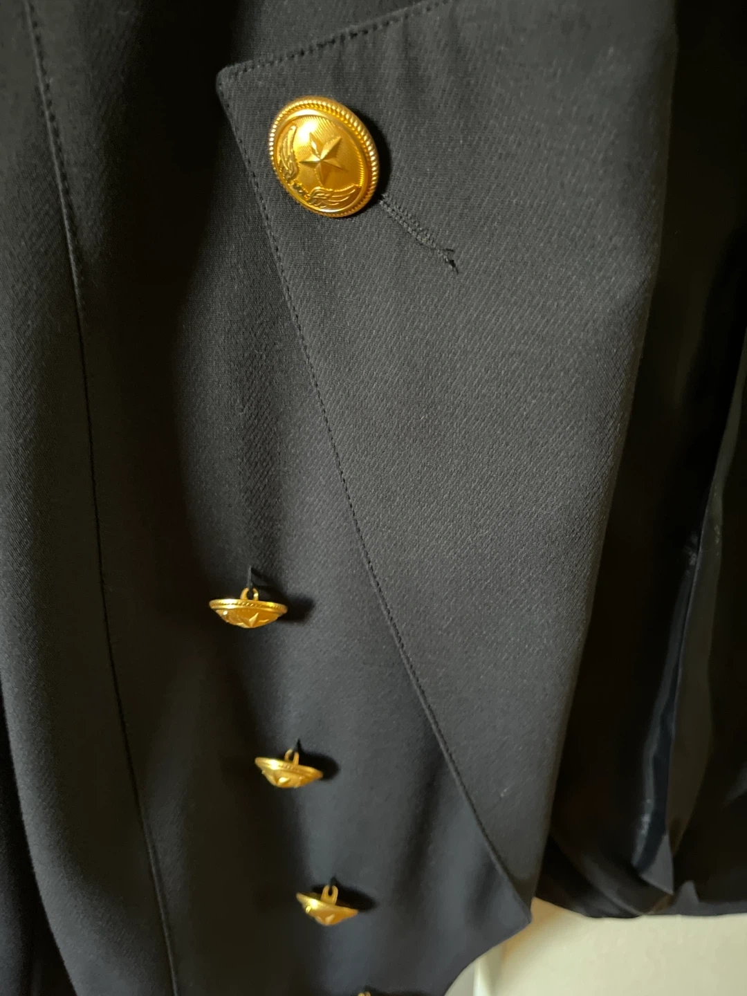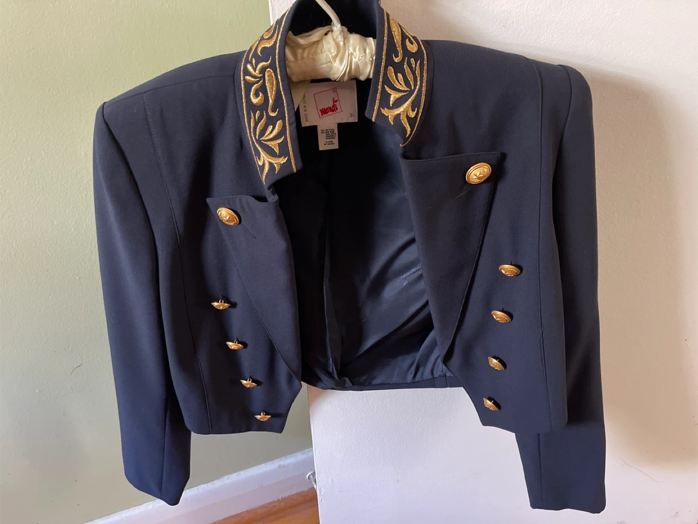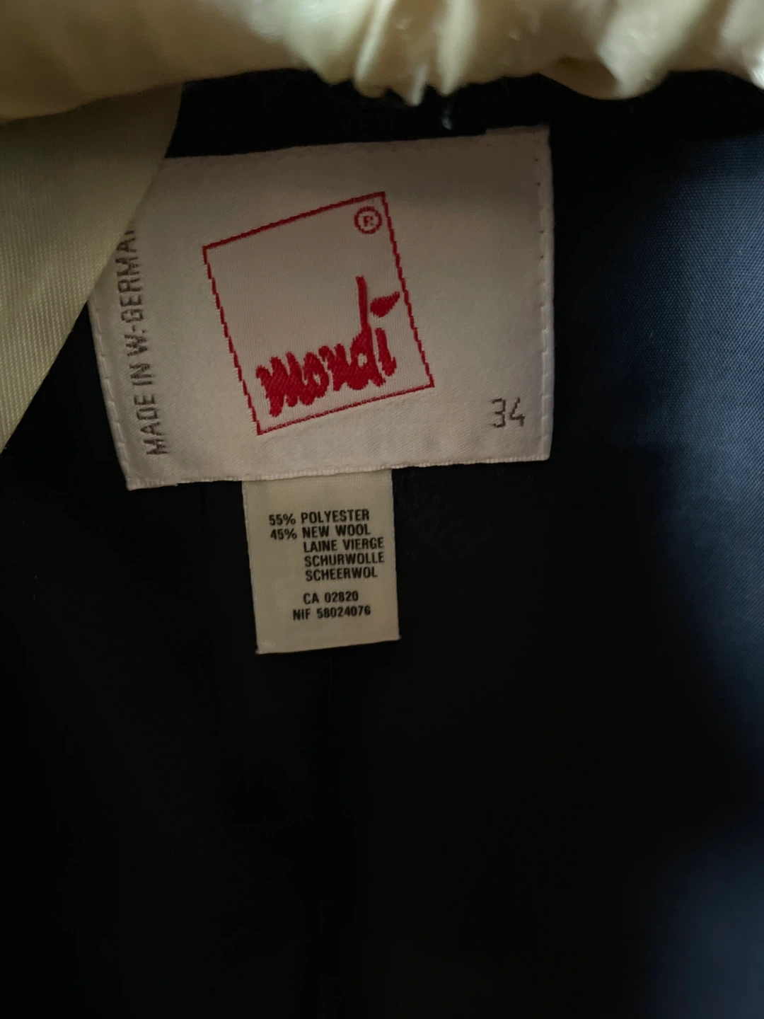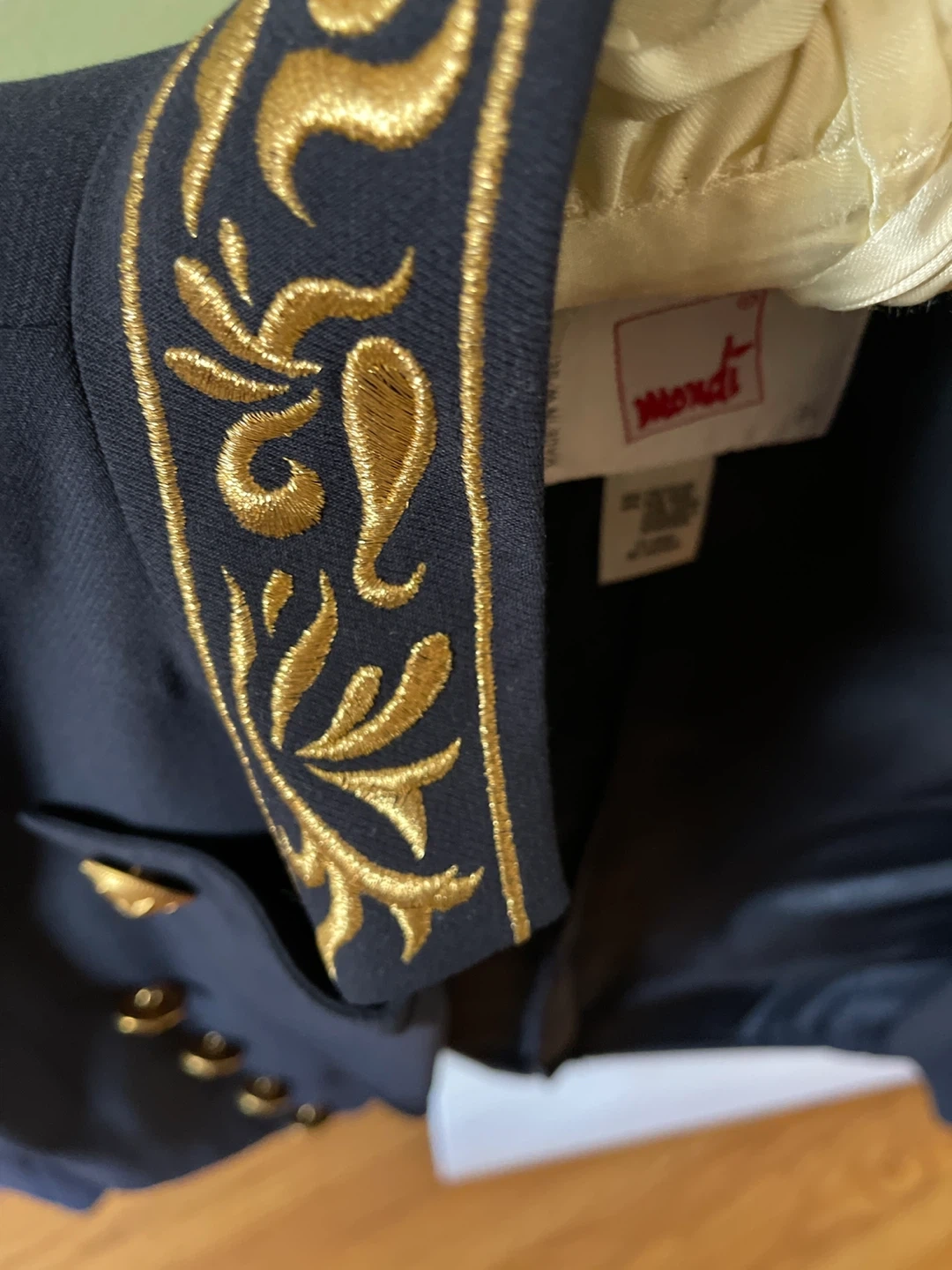 Selling a Mondi cropped blazer in size 34. It's a stylish piece with gold embroidery and buttons. The blazer is made of 55% polyester and 45% new wool. Perfect for adding a touch of elegance to any outfit!