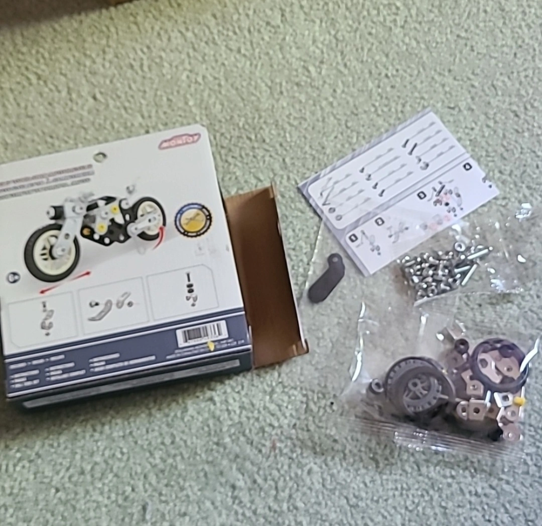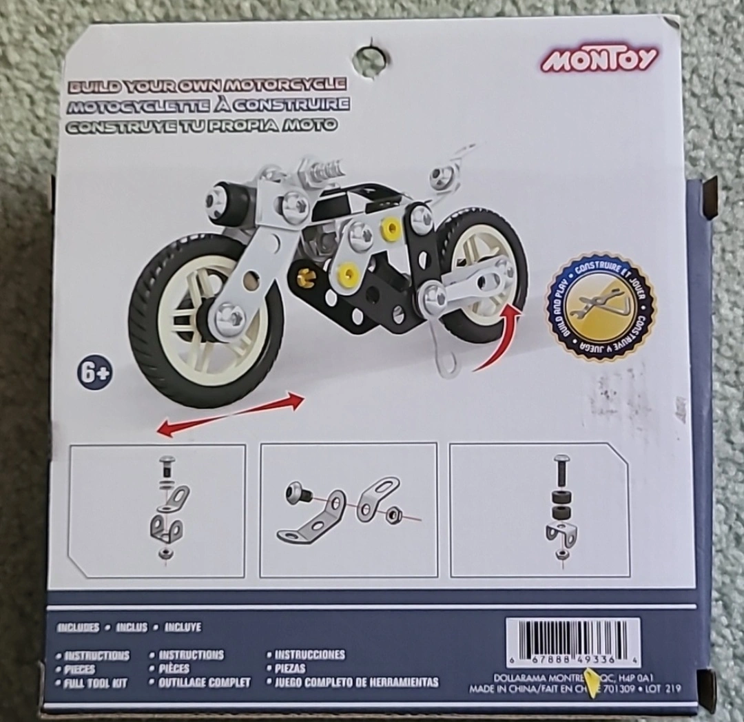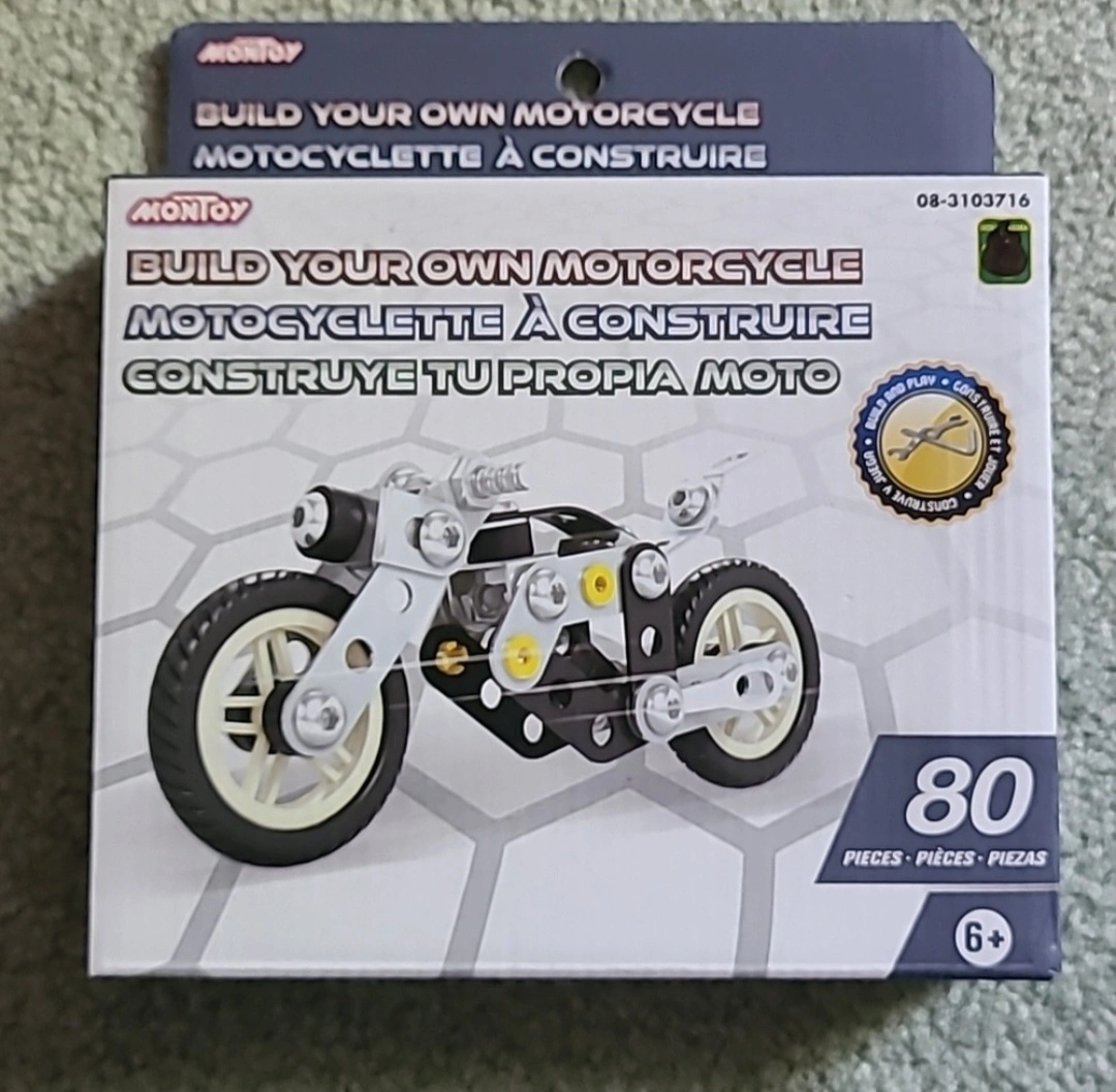 Build your own motorcycle with this Montoy kit! It includes 80 pieces and is recommended for ages 6 and up Includes: - Instructions - Pieces - Full tool kit