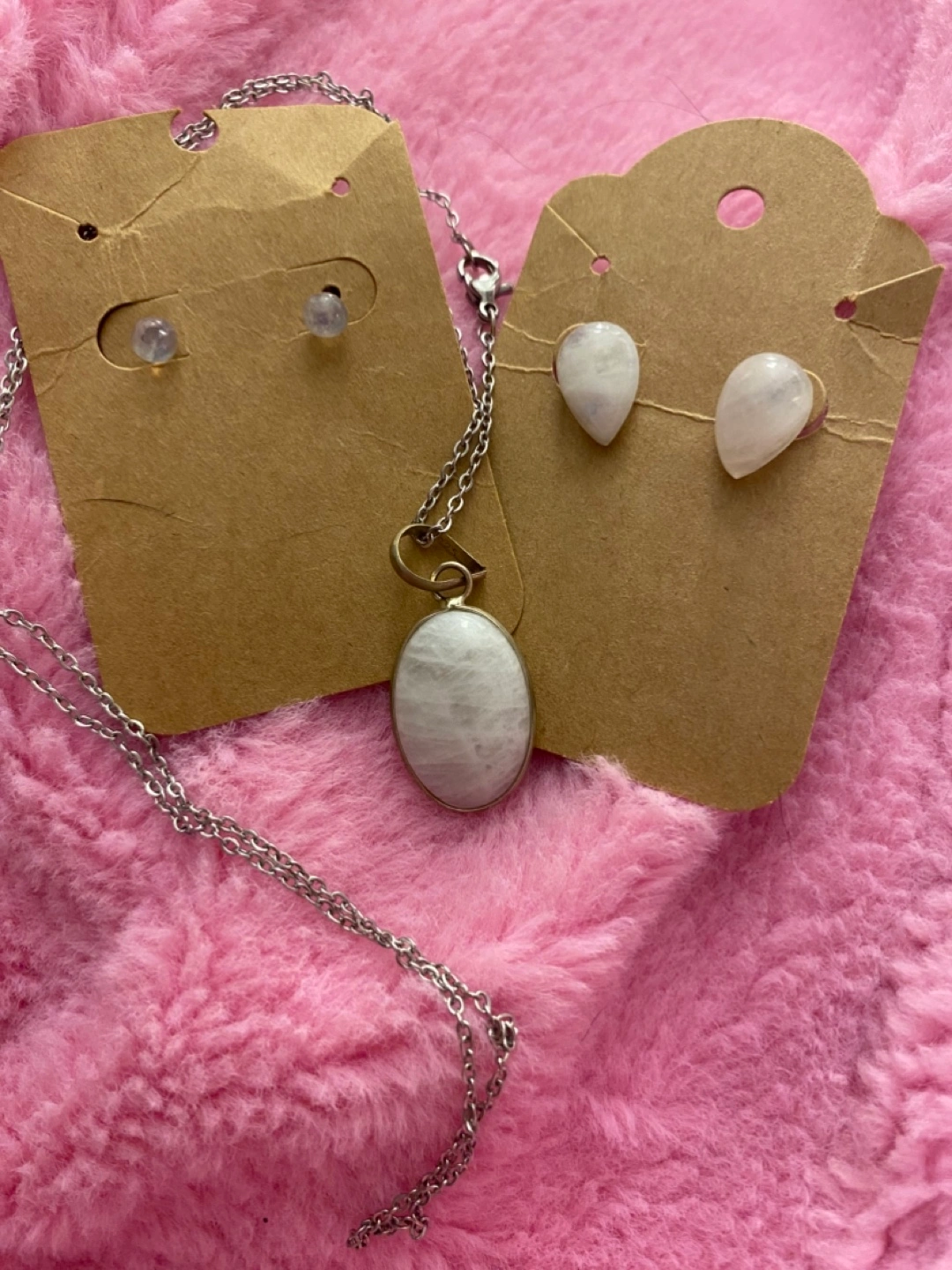 Beautiful moonstone jewellery set. Includes a necklace with an oval pendant and a pair of teardrop earrings. Silver toned (made of stainless steel)chain and settings. Perfect for layering or wearing alone. Bonus teeny tiny moonstone studs $20 for the set