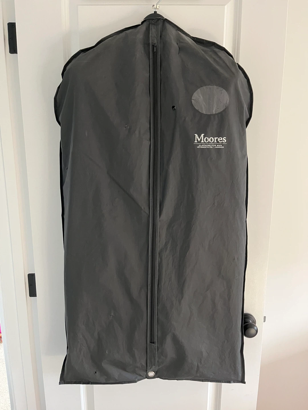 Selling a Moores Wilke Rodriguez men's suit in grey. The suit comes with a garment bag for storage and protection. It's in great condition and ready for a new owner!