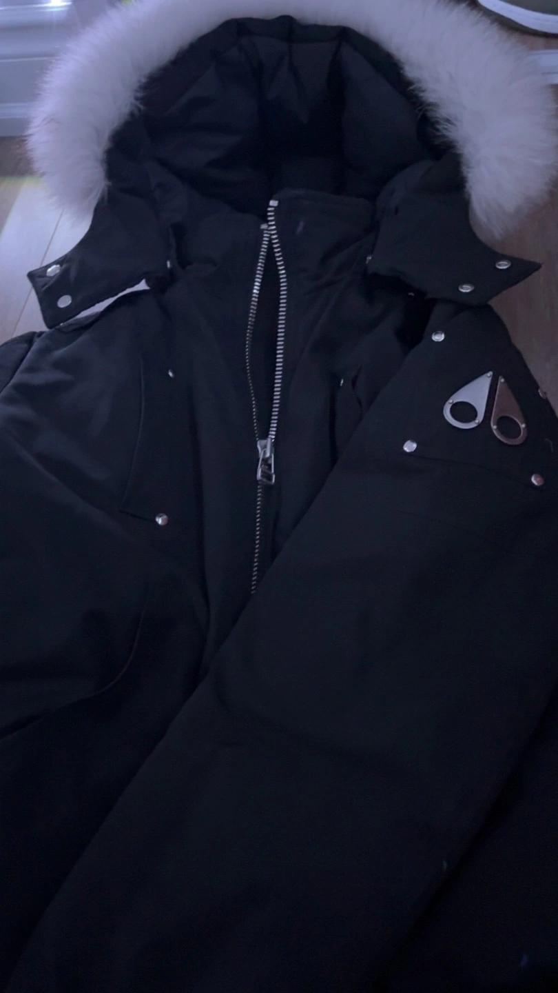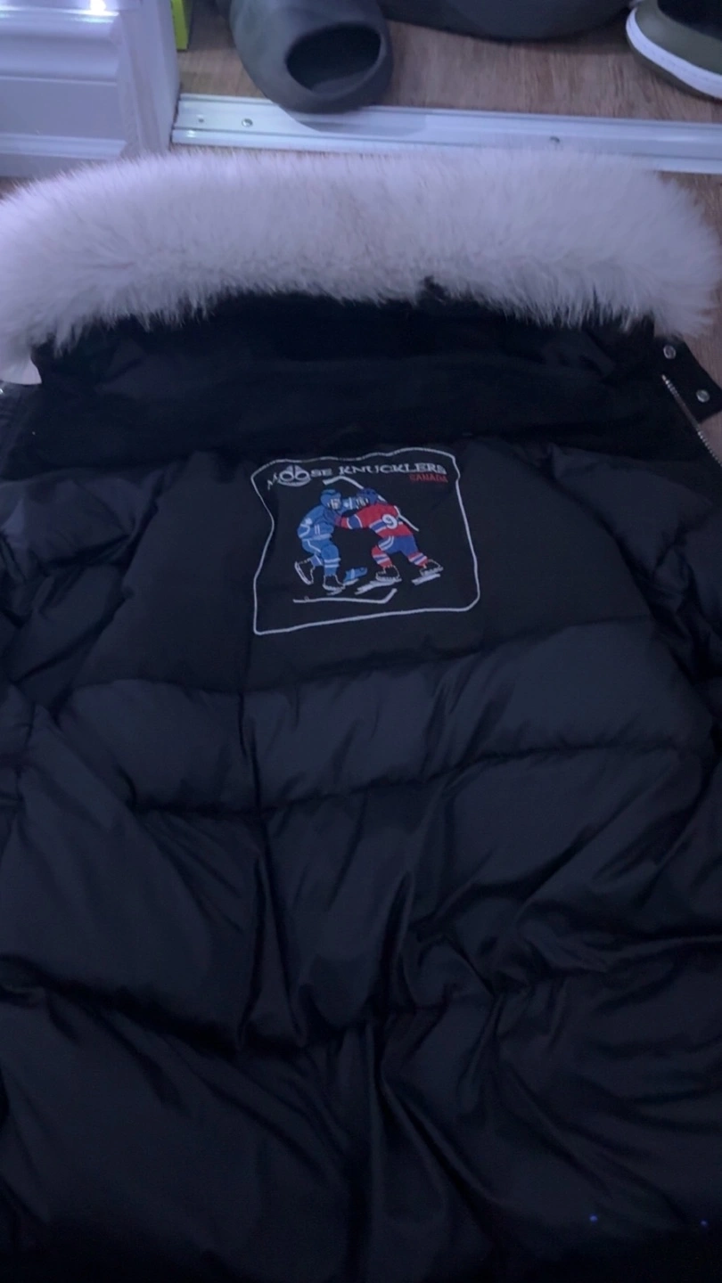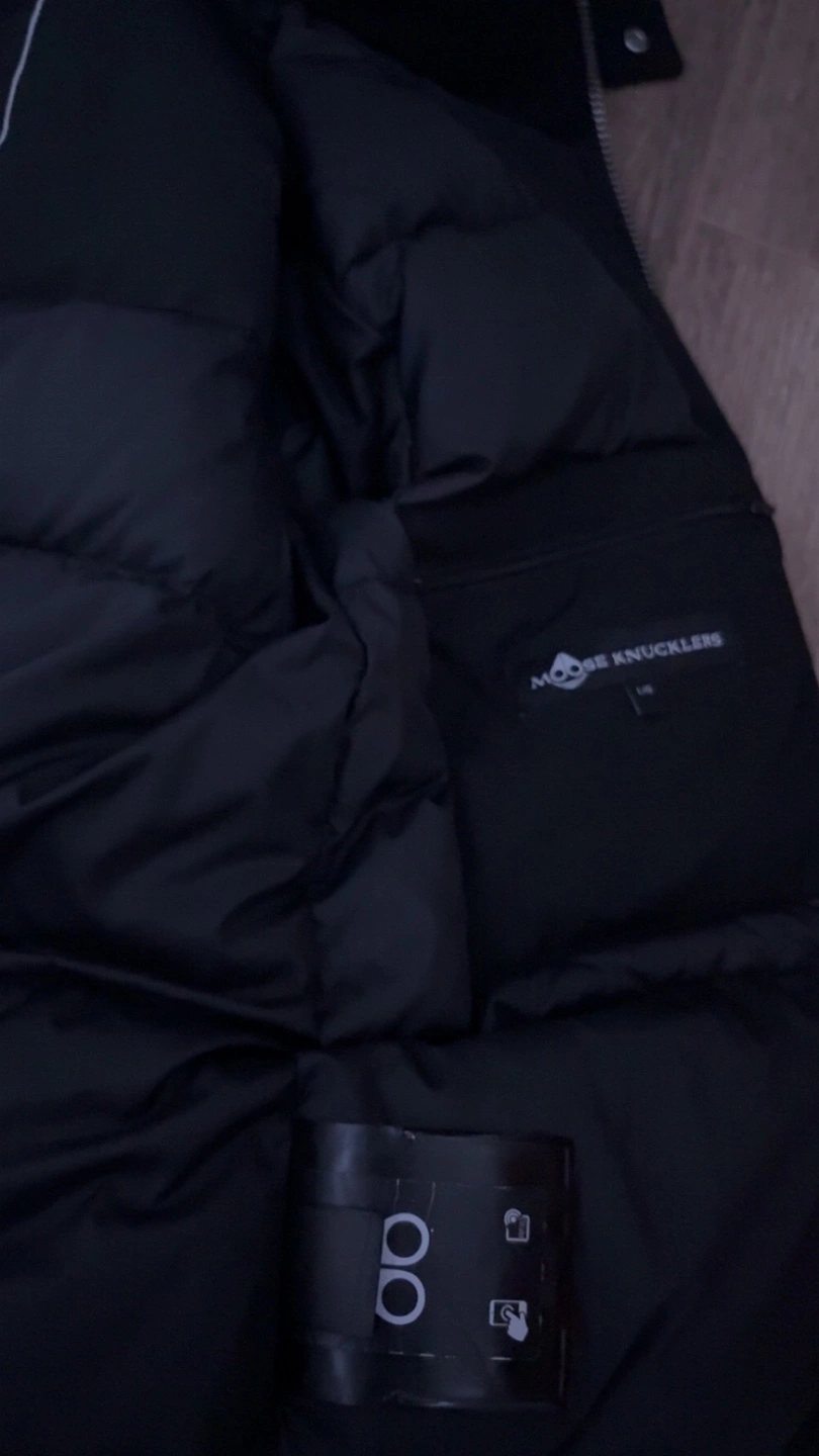 Black down-filled jacket. Features a faux fur-trimmed hood and zipper closure. Size large. Excellent for cold weather.