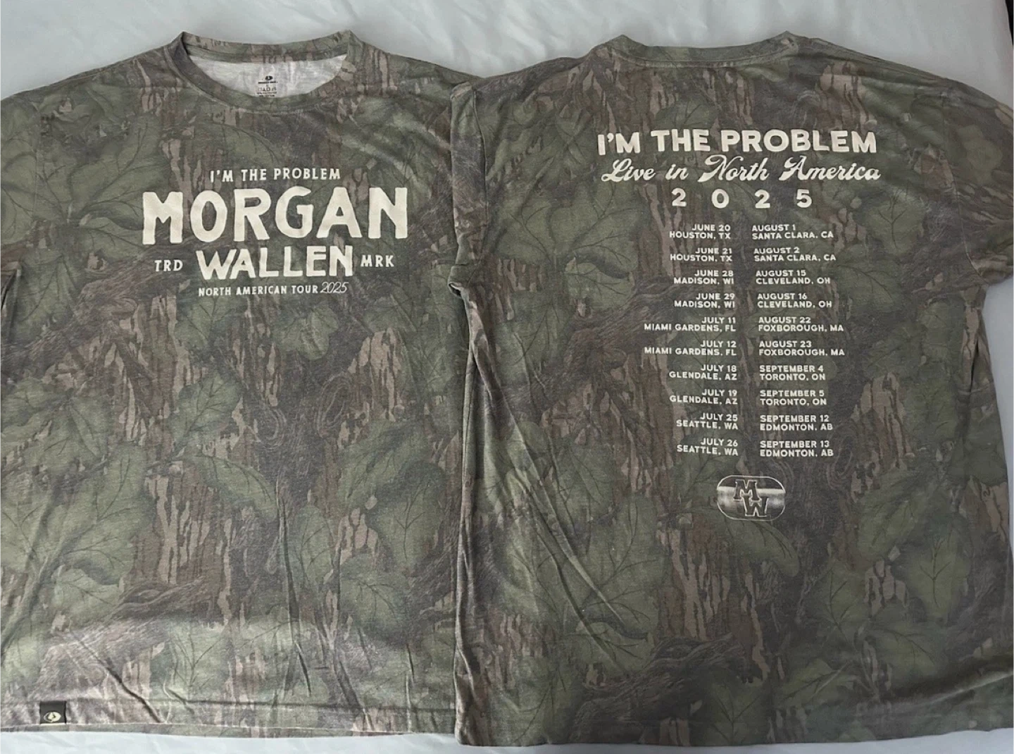 Selling a Morgan Wallen 'I'm the Problem' t-shirt from the North American Tour 2025! The shirt has a cool camo design and lists all the tour dates and locations on the back, including the Edmonton, AB dates