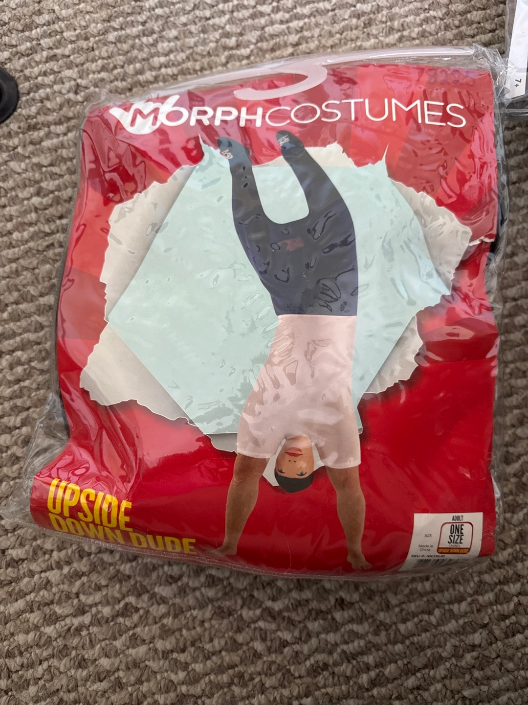 Selling a brand new, in-package MorphCostumes Upside Down Dude adult costume! It's a one-size-fits-most costume, perfect for a fun and silly look