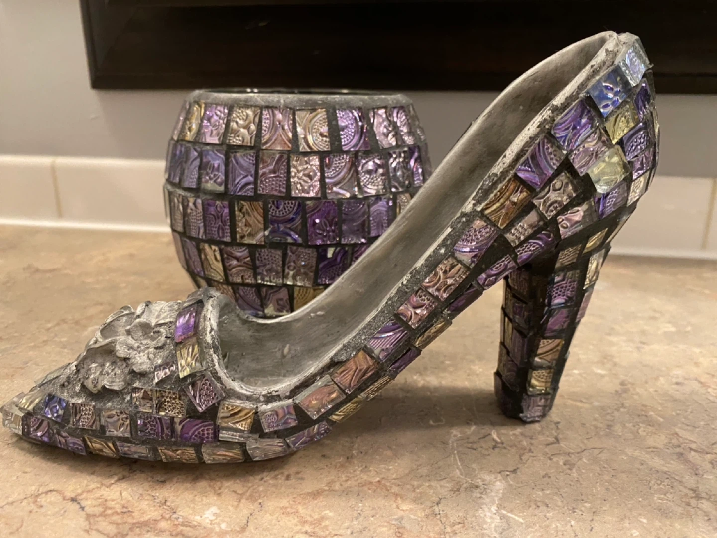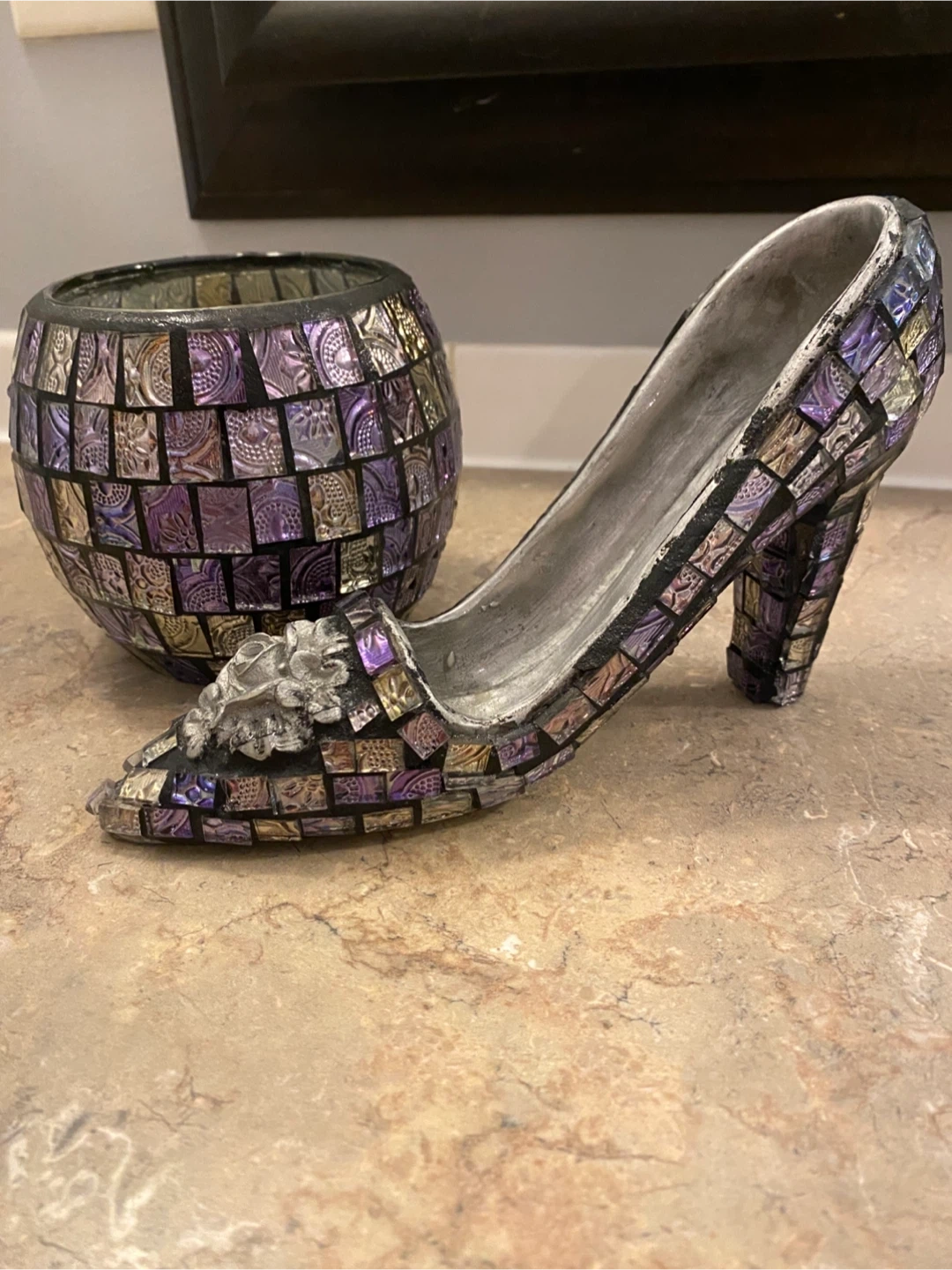 Selling a cute mosaic glass decor set! Includes a decorative shoe and a matching vase. The mosaic pattern features shades of purple, silver, and gold. Perfect for adding a touch of sparkle to any room
