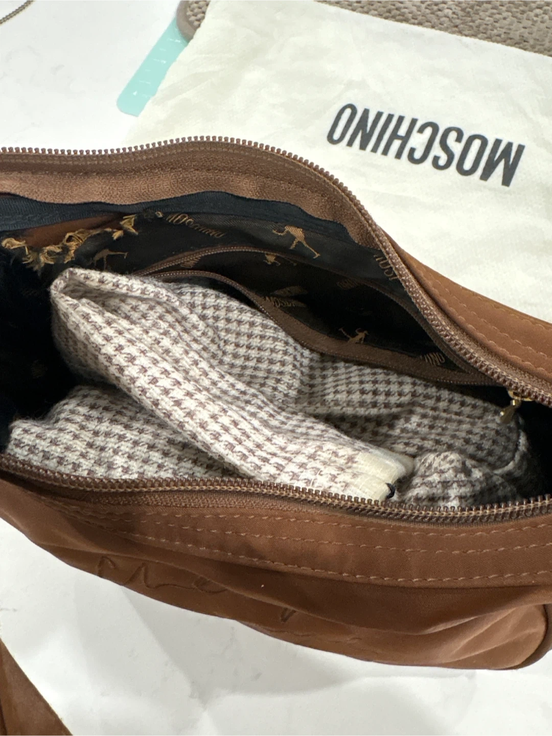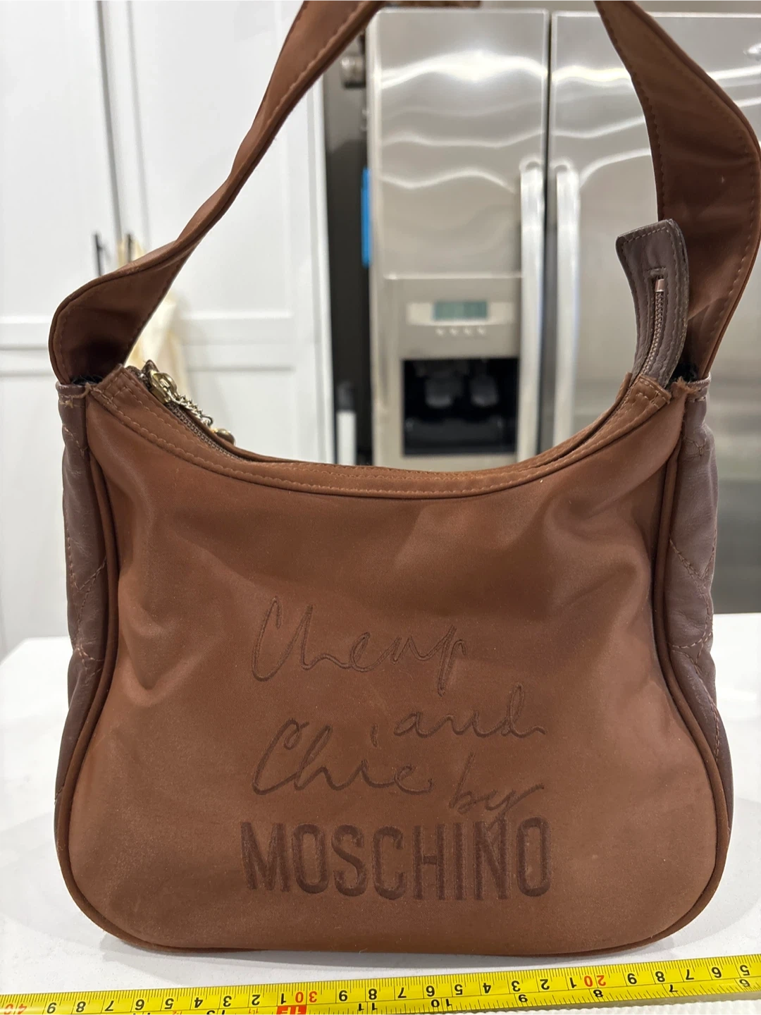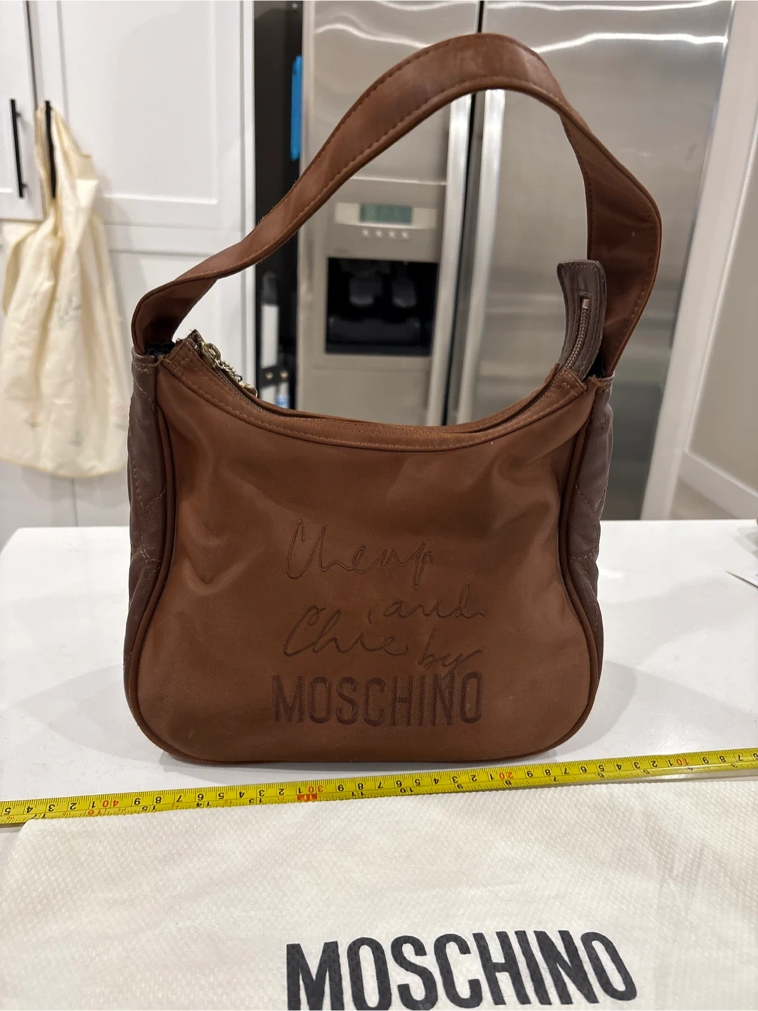 Selling a Moschino Cheap and Chic shoulder bag in brown. It's in good condition and perfect for everyday use. The bag features the Moschino logo and has a zippered closure. It's a stylish and practical accessory! Used , inside lining little damage