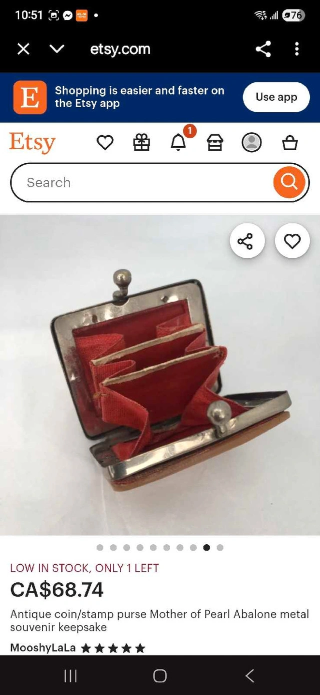 This is a used antique Mother of Pearl coin purse with a metal frame, perfect for collectors or anyone who appreciates vintage accessories. The coin purse features a beautiful iridescent finish, showcasing the natural beauty of mother of pearl. The clasp and hinges are functional. Note, there is a small chip on the mother of pearl, see photos for details. If you have a soft spot for relics from bygone eras, this coin purse might just be your cup of tea! If the ad's still up, the coin purse is waiting for you! I've looked around Kijiji and similar purses tend to sell in the $50-$80 range.