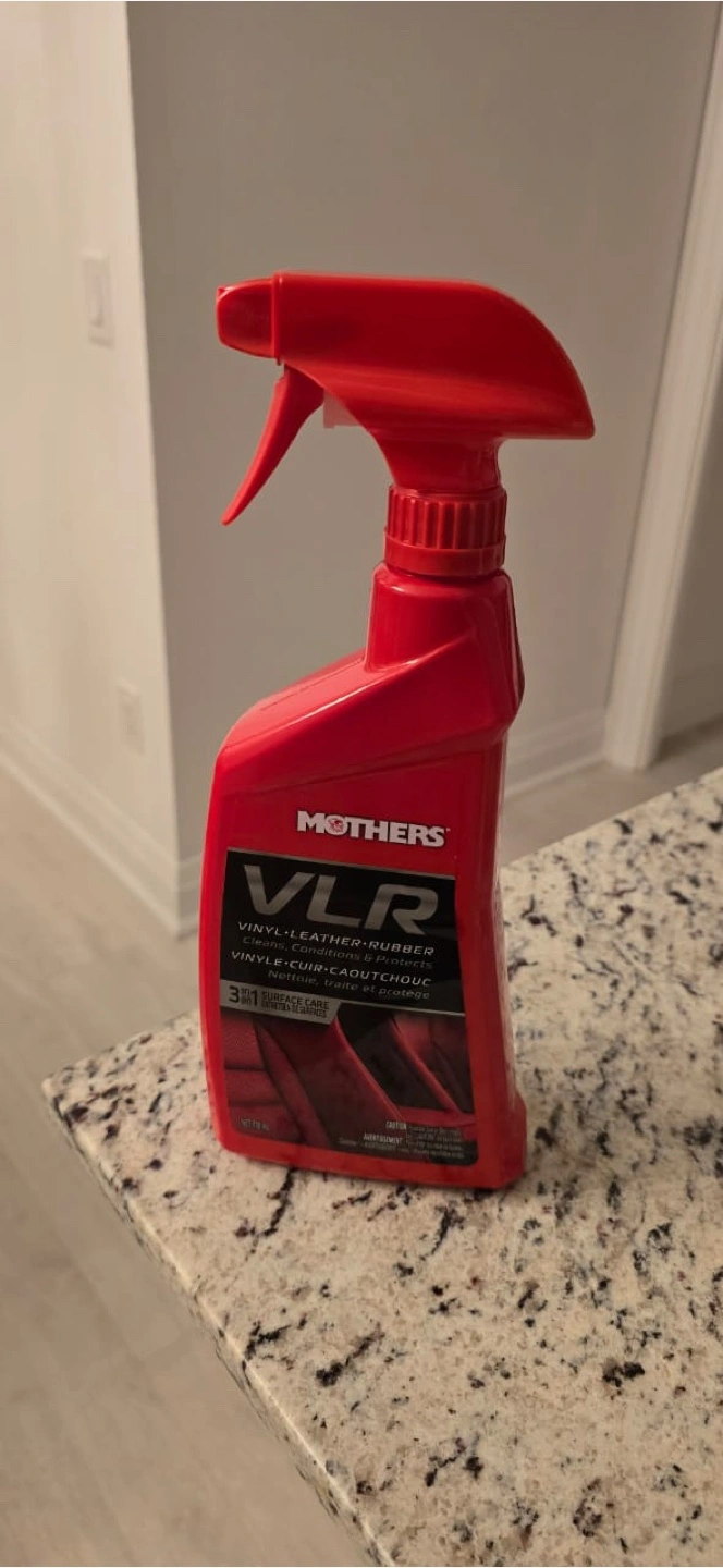 Red bottle with a spray nozzle. The label is in English and French. Great for a nice clean car interior, leaving you with a sense of accomplishment and peace.