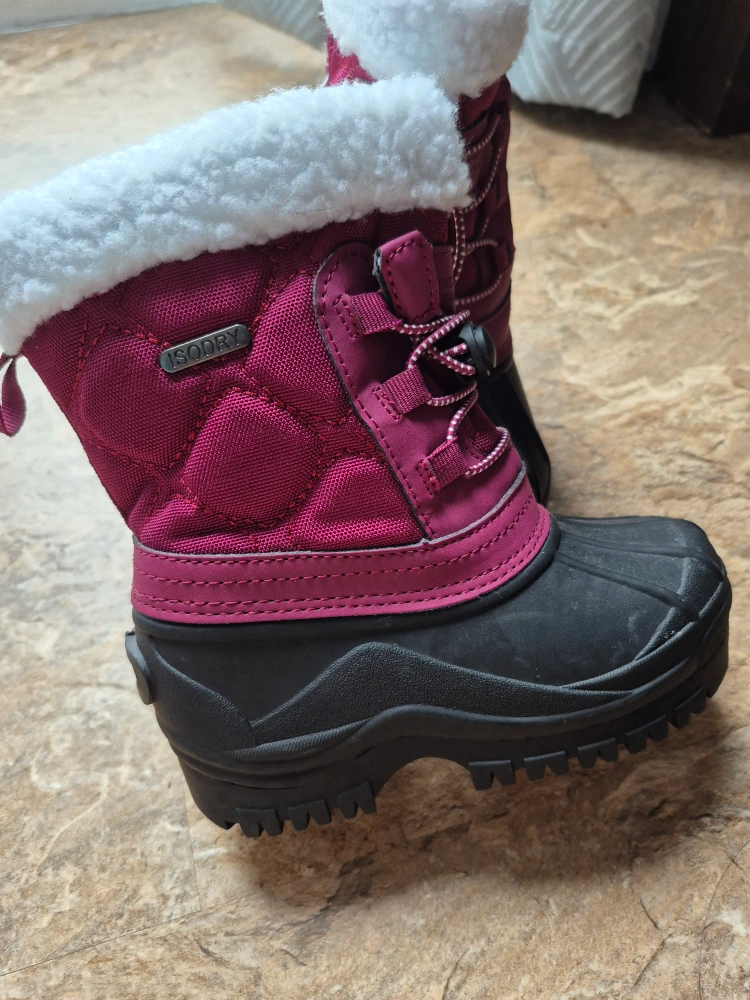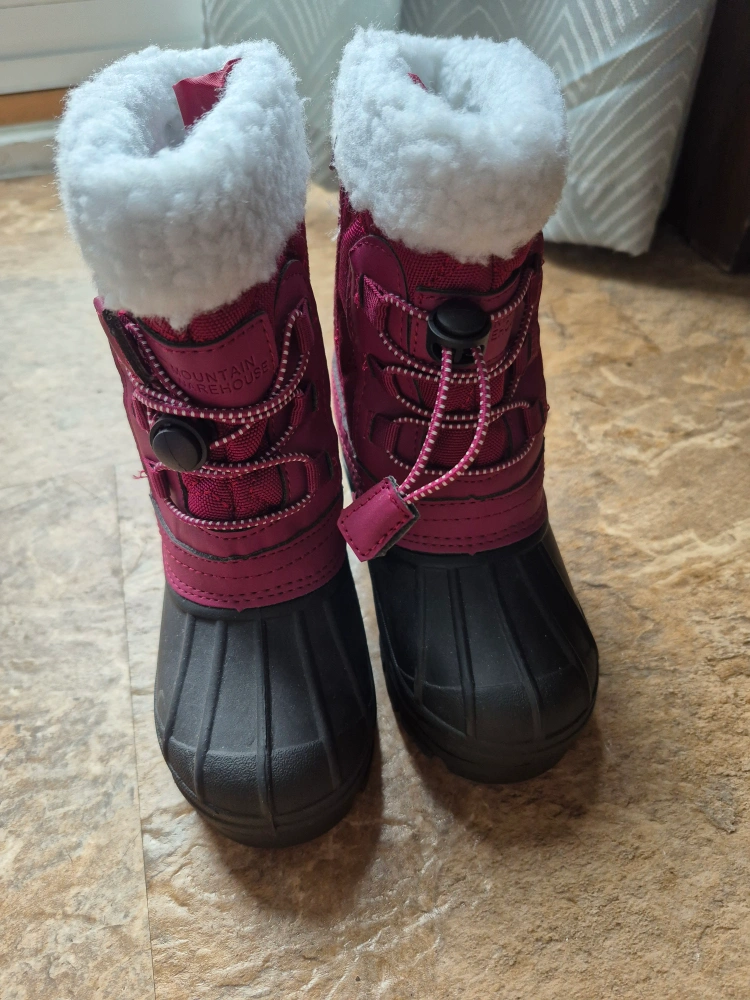 Adorable pink winter boots. Waterproof outer shell. Warm, fuzzy lining. Great for snow and cold weather. Lace-up closure and easy-to-use toggle. Durable sole. Size 10