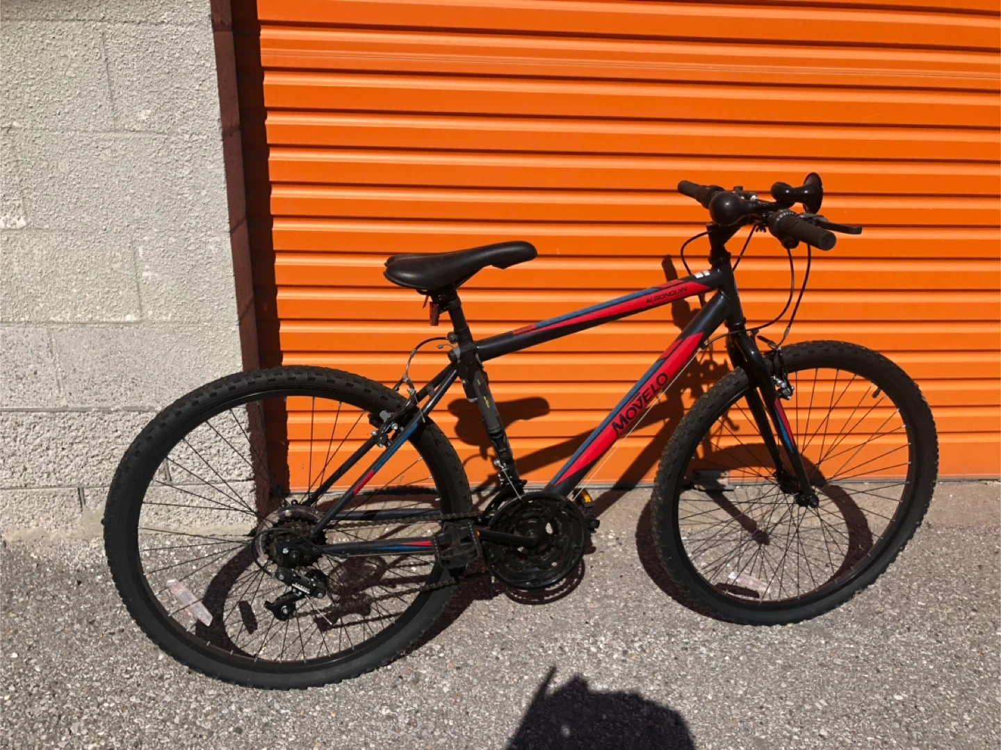 Selling a Movelo Algonquin mountain bike. It's in good condition and ready for some trails or city riding! The frame has a sleek design with red and blue accents on a black base. Perfect for anyone looking for a reliable and stylish bike