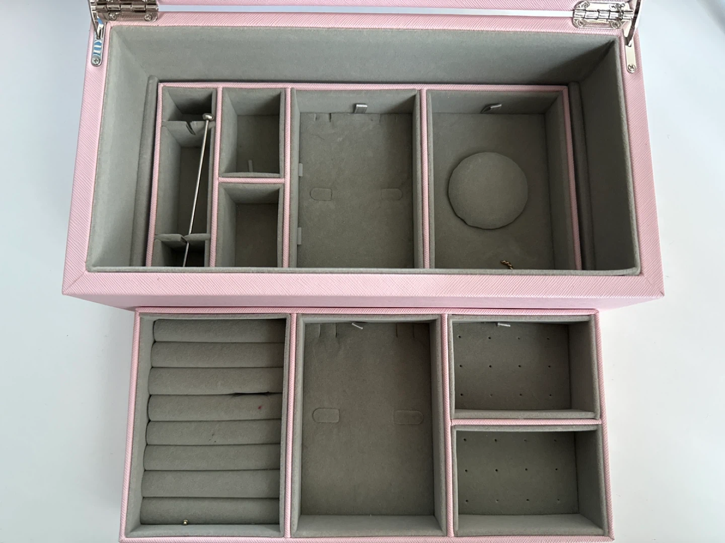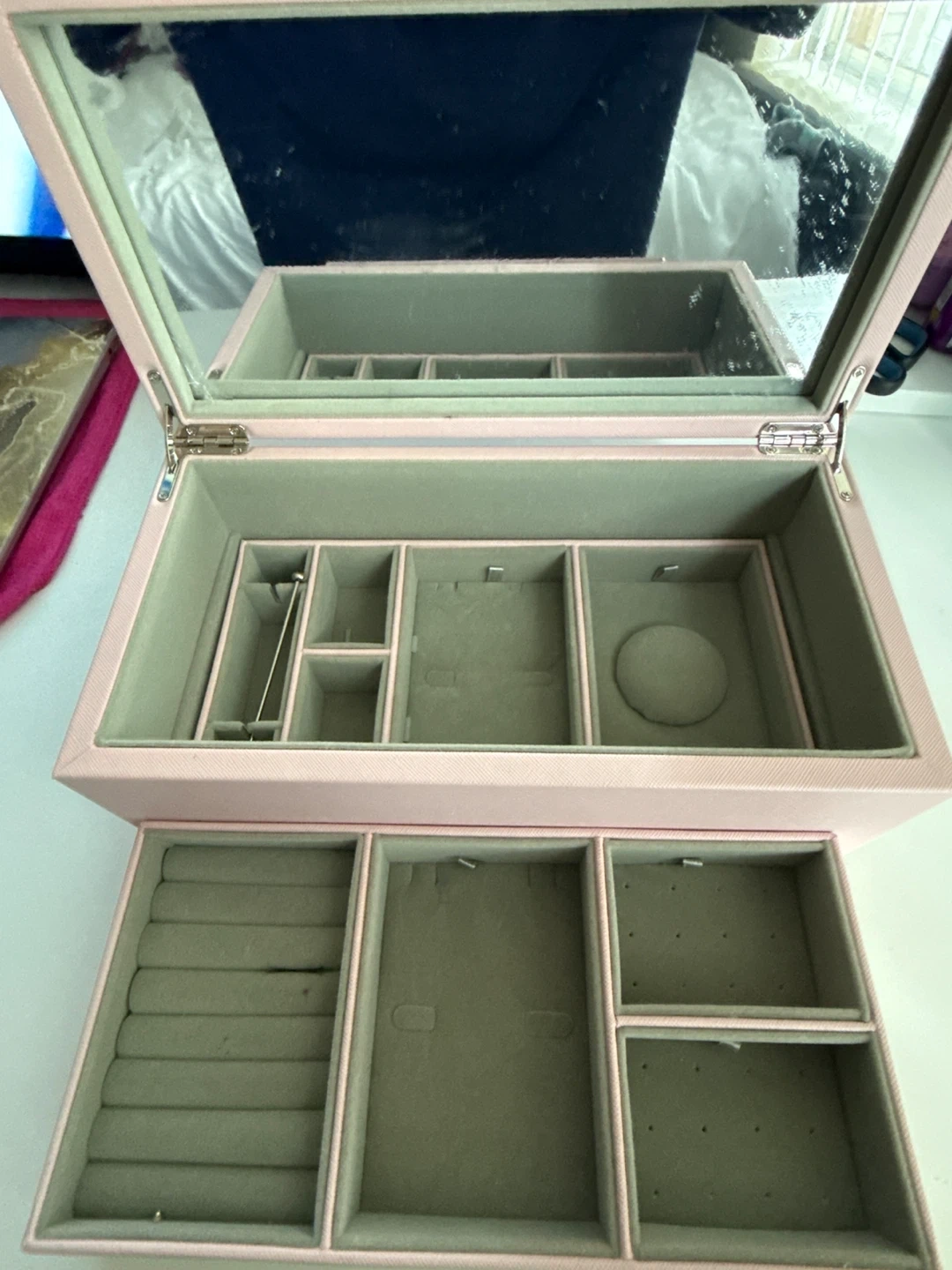 Selling a cute Pandora jewellery box! It's in great shape and perfect for keeping your favourite pieces organized. It's pink, with a mirror, and has lots of compartments for rings, necklaces, and earrings