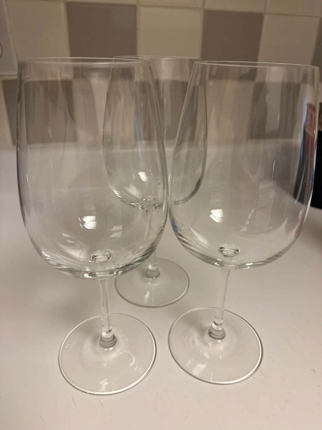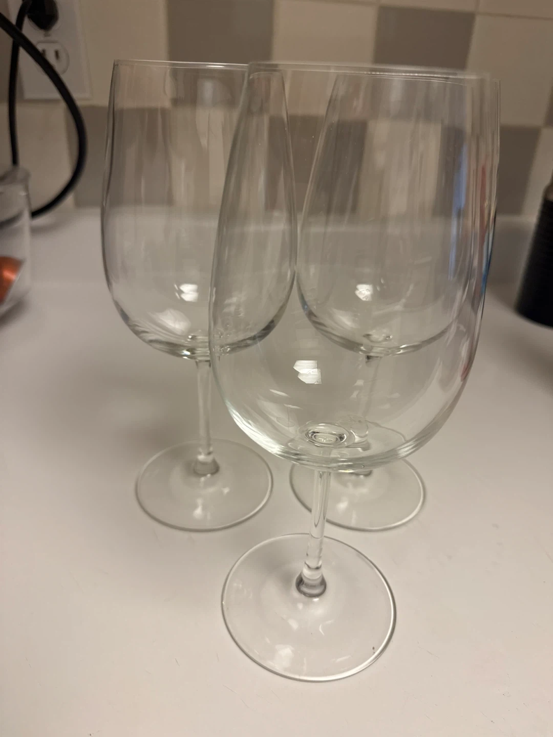 Selling a set of 3 wine glasses. They're in great condition and ready for your next dinner party or cozy night in! They're clear glass and have a classic shape.