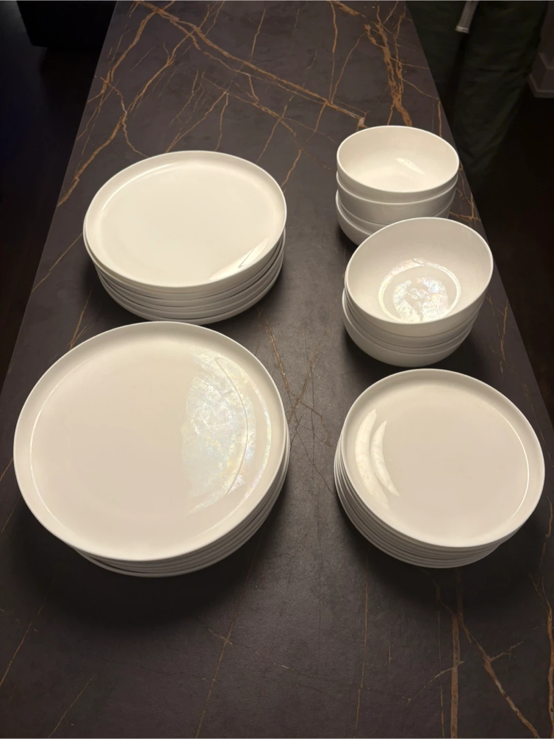 Moving sale! Beautiful EQ3 Raval dinnerware set in classic white — simple, elegant, and perfect for everyday use or entertaining. Includes: • 12 × Large dinner plates (10.25”) • 8 × Side plates (8.”) • 8 × Bowls (6.25”) All pieces are in great condition — no chips or cracks, just gentle use. Originally from EQ3 (currently $179 per 16-piece set). Selling as a full lot for $125 OBO. Pickup near St. Clair and Oakwood.