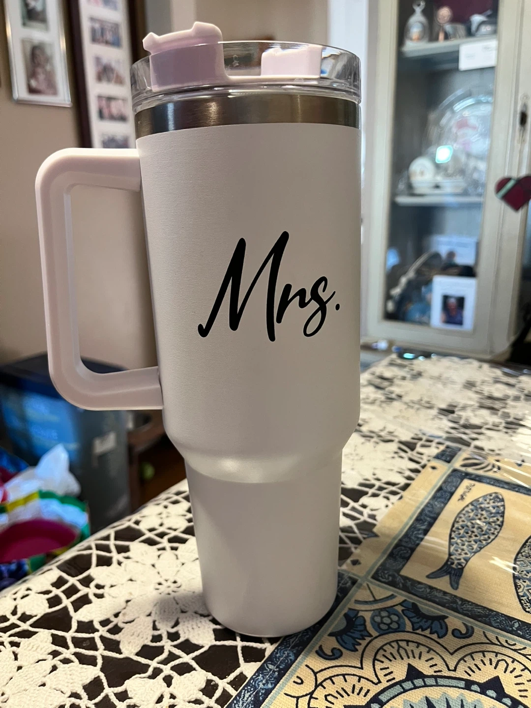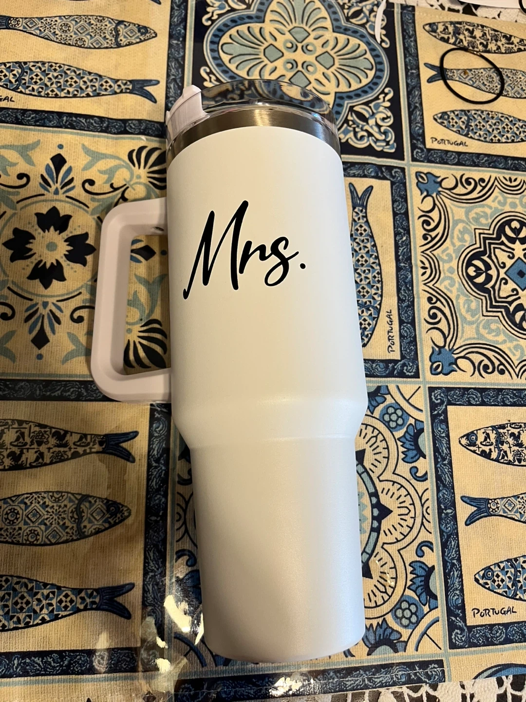 Selling a white tumbler with 'Mrs.' printed on it. It has a convenient handle and is in great condition. Perfect for keeping your drinks hot or cold!