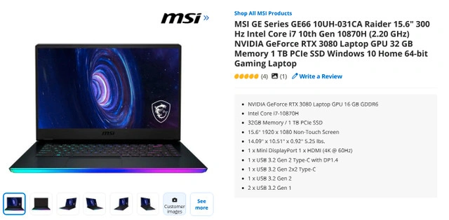 Selling my MSI GE66 Raider gaming laptop, it's in used but great condition. This powerhouse features an Intel Core i7-10870H processor, NVIDIA GeForce RTX 3080, 32GB of RAM, and a lightning-fast 1TB PCIe SSD. The vibrant 15.6" 300Hz display offers an immersive gaming experience. Specs: * NVIDIA GeForce RTX 3080 Laptop GPU 16 GB GDDR6 * Intel Core i7-10870H * 32GB Memory / 1 TB PCIe SSD * 15.6" 1920 x 1080 Non-Touch Screen * 1 x Mini DisplayPort 1 x HDMI (4K @ 60Hz) * 1 x USB 3.2 Gen 2 Type-C with DP1.4 * 1 x USB 3.2 Gen 2x2 Type-C * 1 x USB 3.2 Gen 2 * 2 x USB 3.2 Gen 1 Looking for $1700. If the ad is up, it's still available!