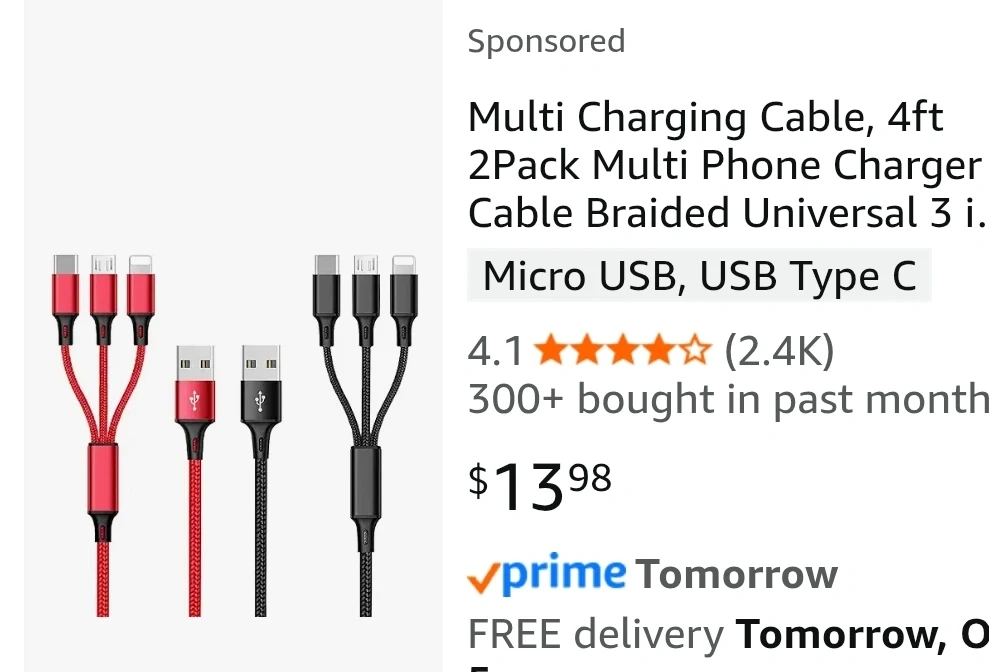 Selling a multi charging cable that's 4ft long. It comes in red and black braided design. It features Micro USB and USB Type C connectors.
