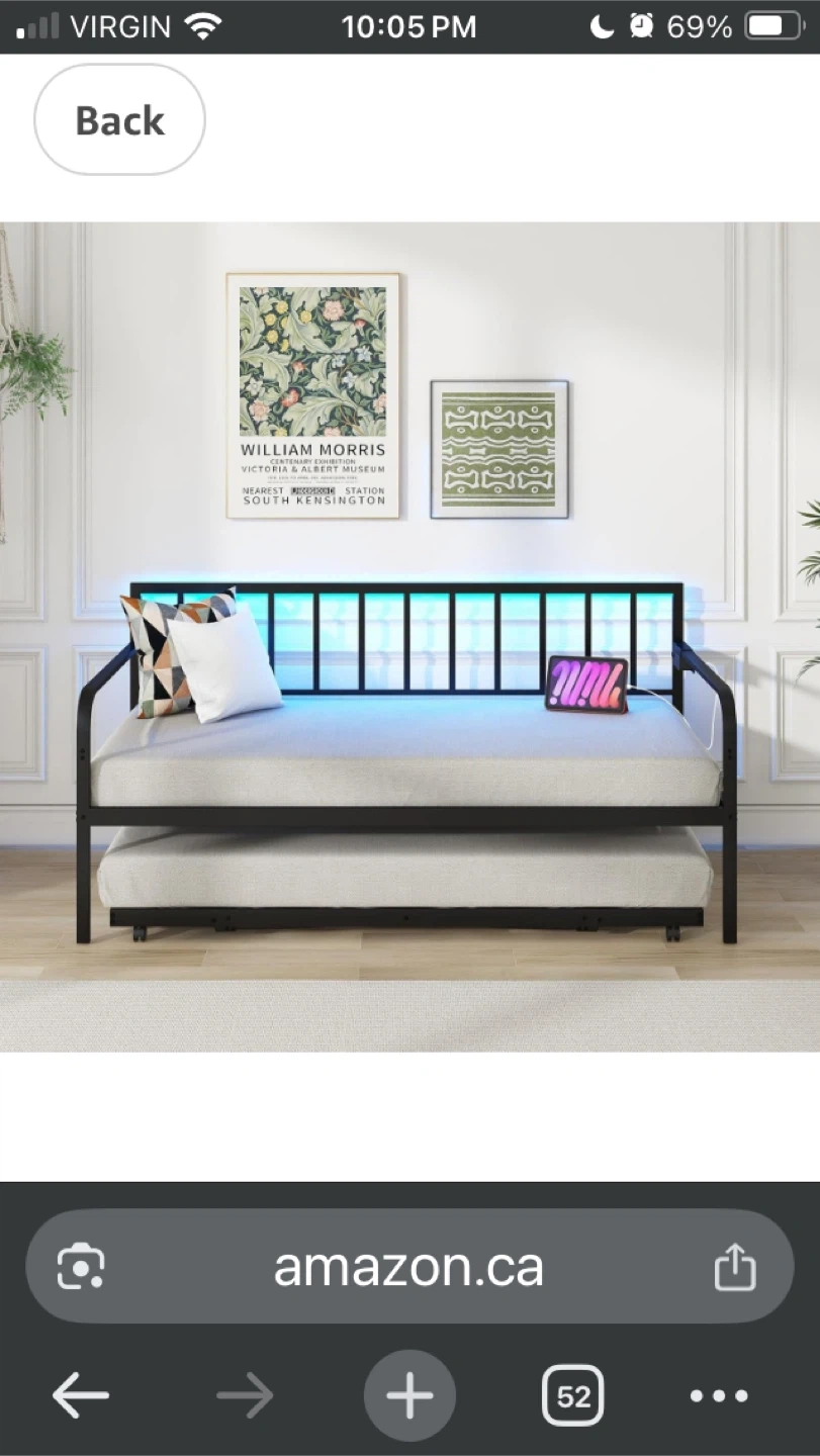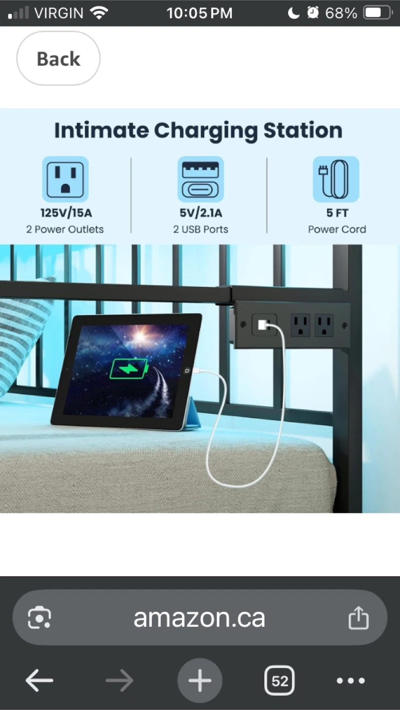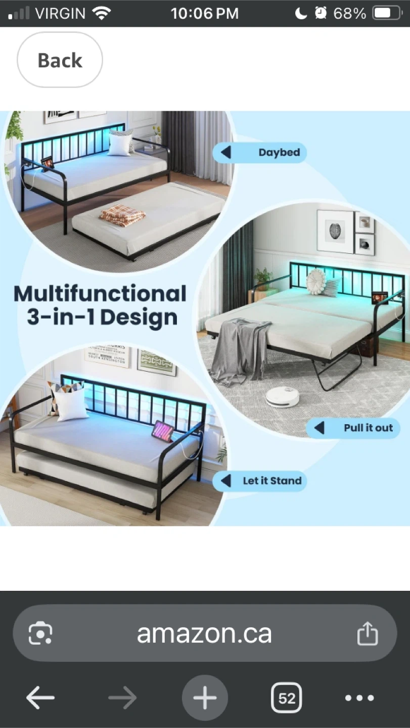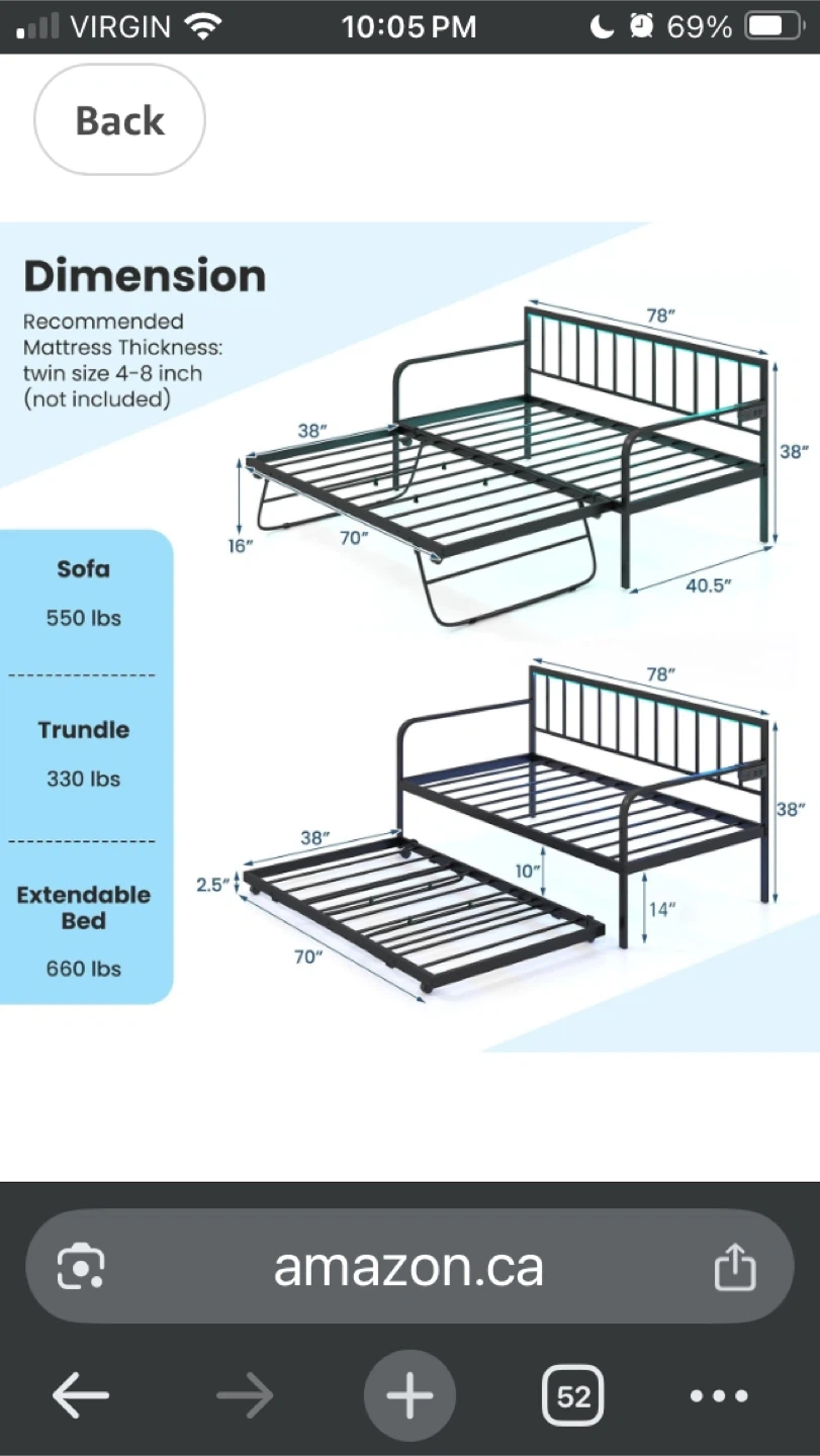 This multifunctional daybed features a 3-in-1 design, easily converting from a daybed to a sofa or an extendable bed. It includes a pull-out trundle for extra sleeping space. The dimensions are approximately 78" in length, 38" in width, and 38" in height when set up as a sofa. It also features an intimate charging station with 2 power outlets (125V/15A), 2 USB ports (5V/2.1A), and a 5 FT power cord 1 mattress included 10” twin size