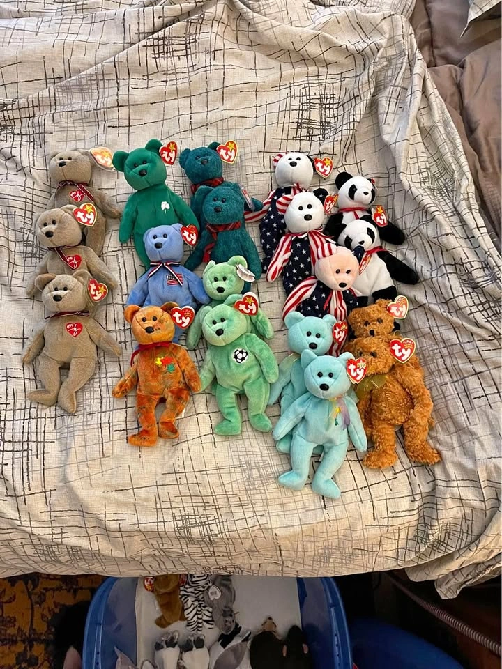 Multiple Beanie Babies for sale. $5 EACH or 5 for $20. Please message seller with inquiries of which are available. Pictures show what is left from main photo. In bin are 4 1999 signature bears and 1 2001 signature bear.