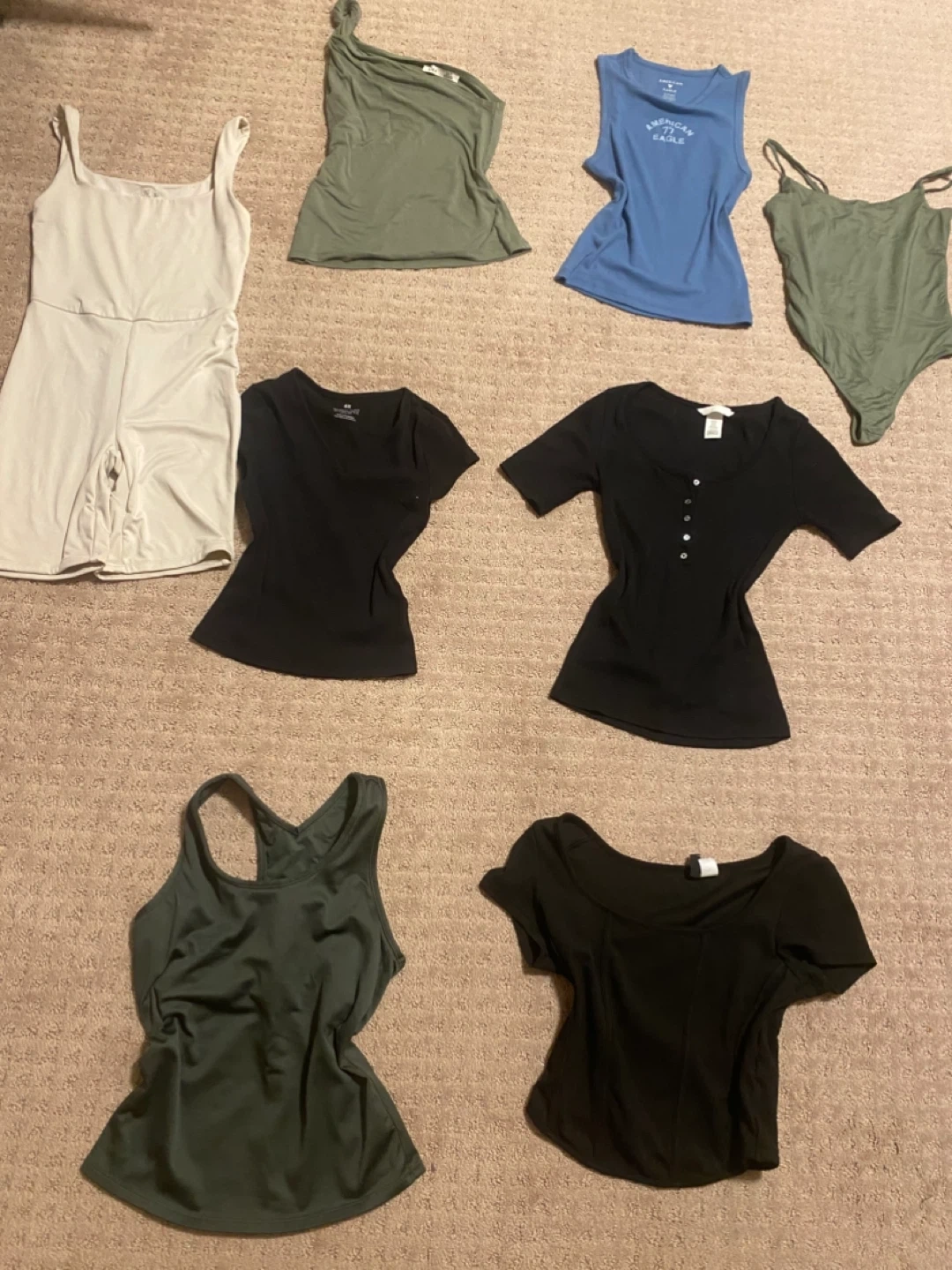 25 for all of it!!! white body suit-SWS CONTOUE (s), green off shoulder-Dex (s), blue tanktop-American Eagle 77 (s), green bodysuit - Ardene (s), All black tops-H&M (s-xs), dark green gym top- ??