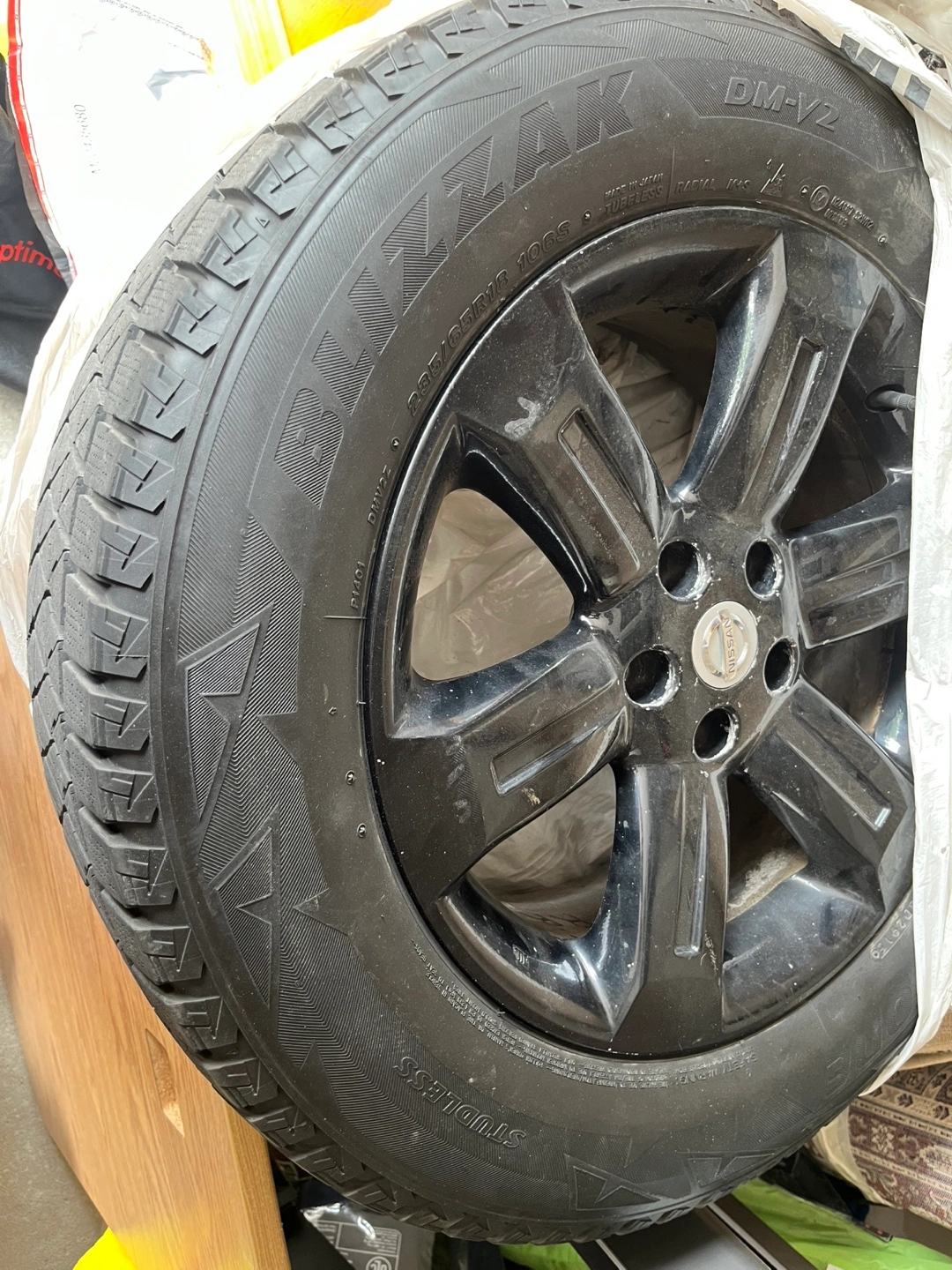 Selling a Murano alloy rims ant tire Bridgestone Blizzak DM-V2 winter tire. The size is 235/65R18. It's a radial M+S tire.