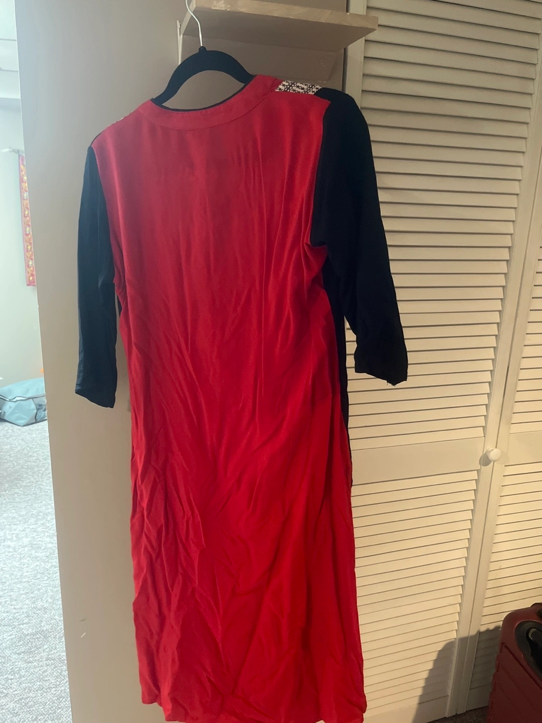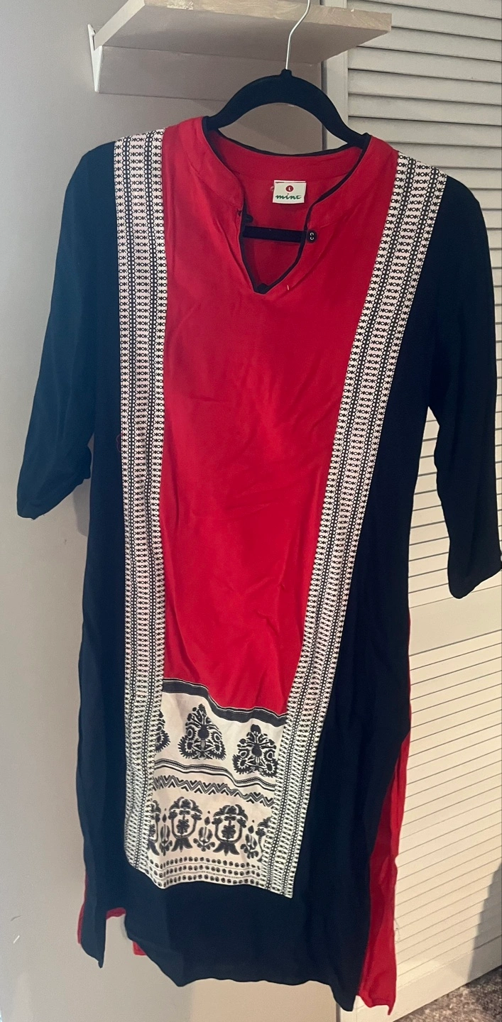 A lovely Muse dress in red and black! It's in great condition and ready for a new home. The dress features a unique design with black sleeves and side panels, a red central panel, and decorative white and black detailing on the front. Perfect for adding a pop of colour to your wardrobe
